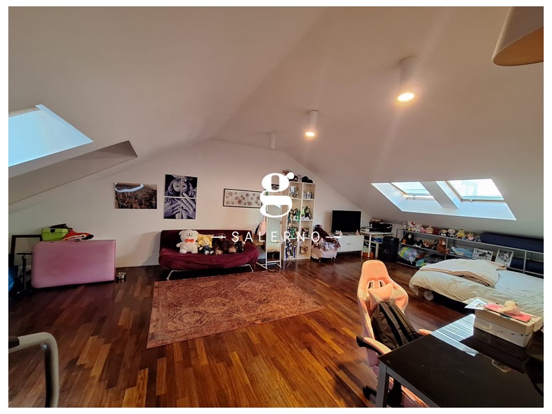 La sua superficie ha consentito la creazione di due vaste zone di cui una rappresenta la zona giorno servita da ben 2 saloni oltre un camera da letto con bagno privato e un secondo bagno servizio del piano. La seconda zona, mansardata, è costituita da un ampio salone, 2 camere e servizi vari con la presenza di un angolo cottura.