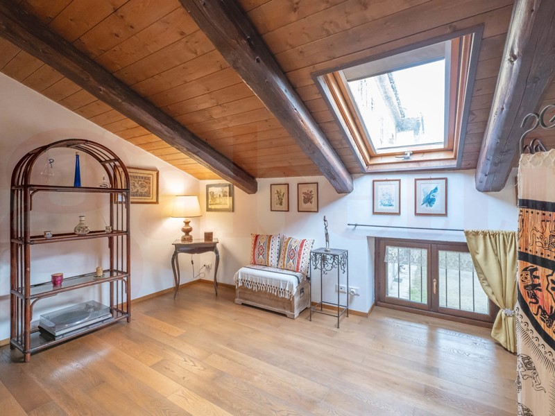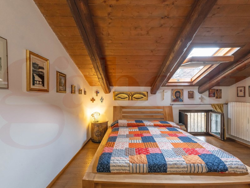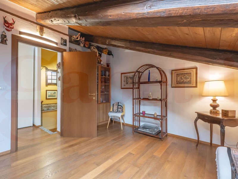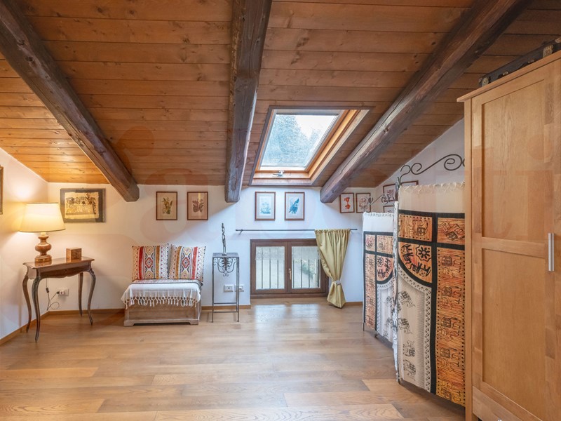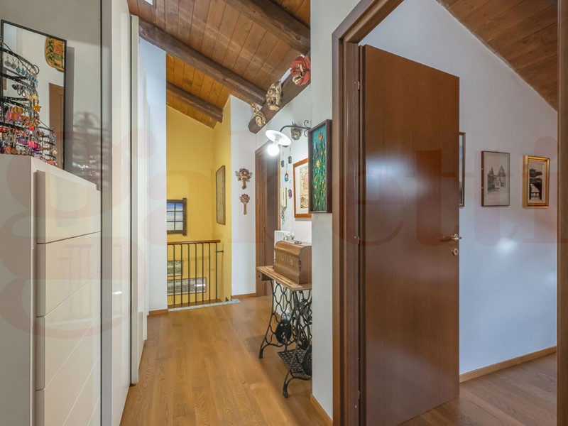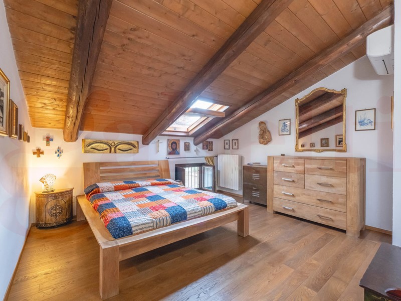 Attraverso la comoda scala interna si raggiunge il primo piano mansardato, dove il soffitto in legno con travi a vista rende gli ambienti caldi e accoglienti. Qui troviamo le due camere da letto ed il secondo bagno.