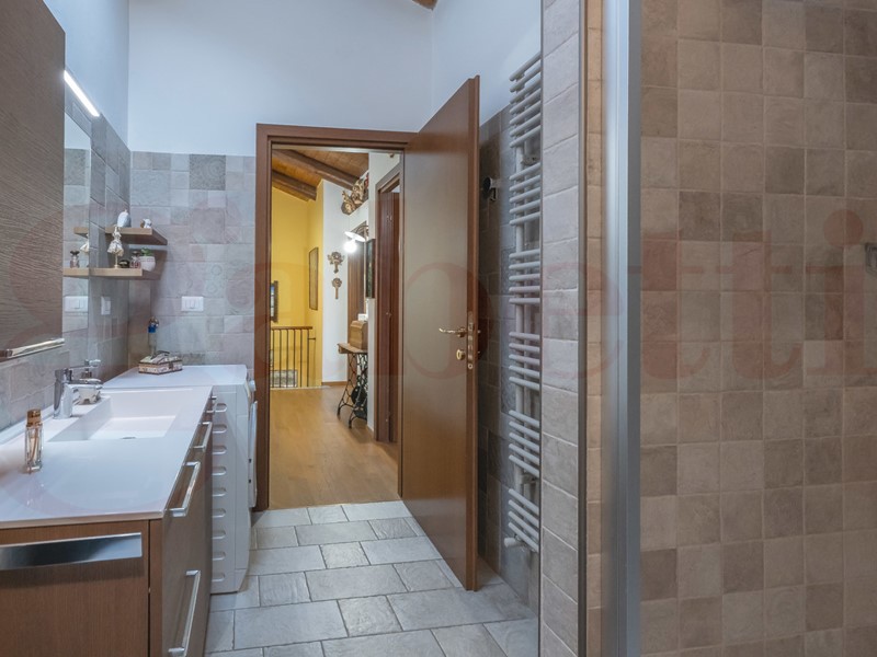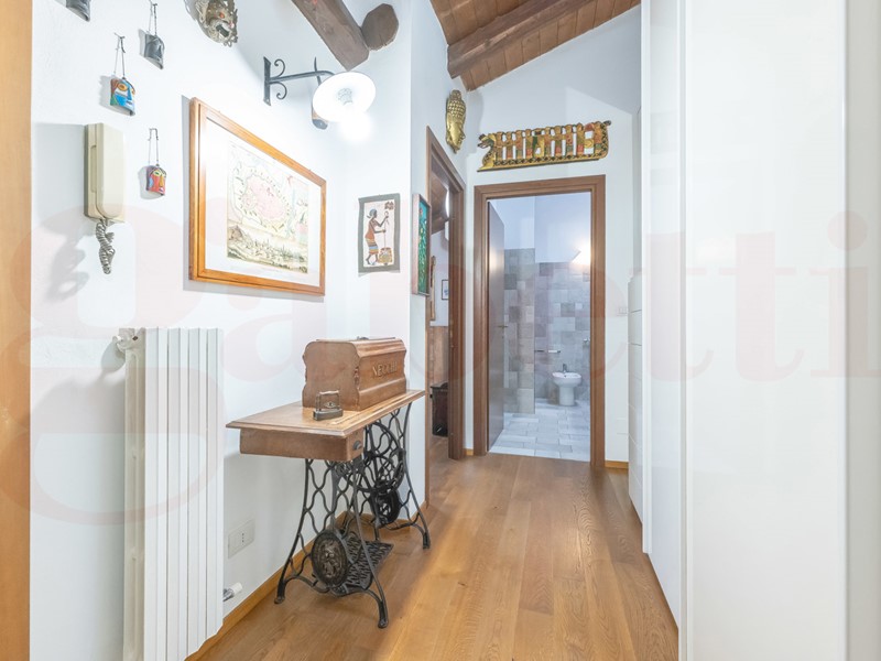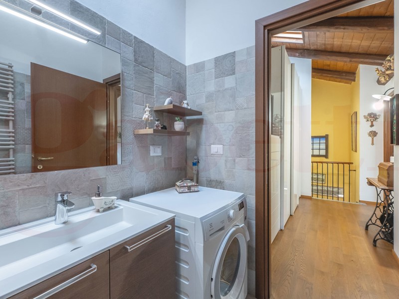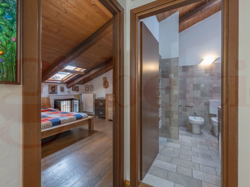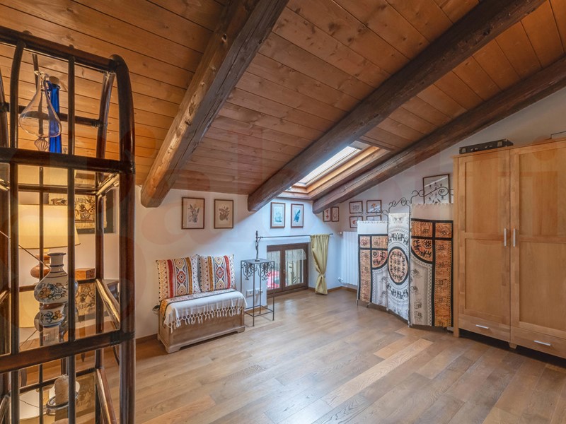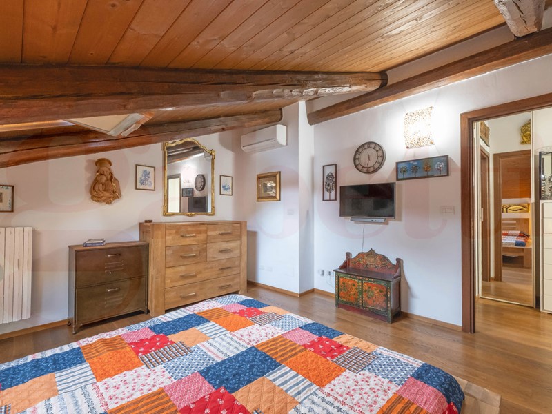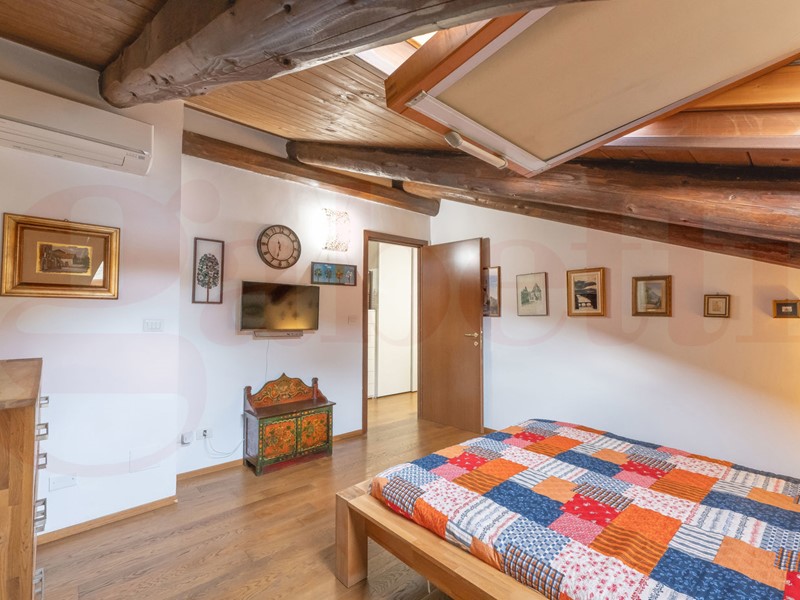Attraverso la comoda scala interna si raggiunge il primo piano mansardato, dove il soffitto in legno con travi a vista rende gli ambienti caldi e accoglienti. Qui troviamo le due camere da letto ed il secondo bagno.