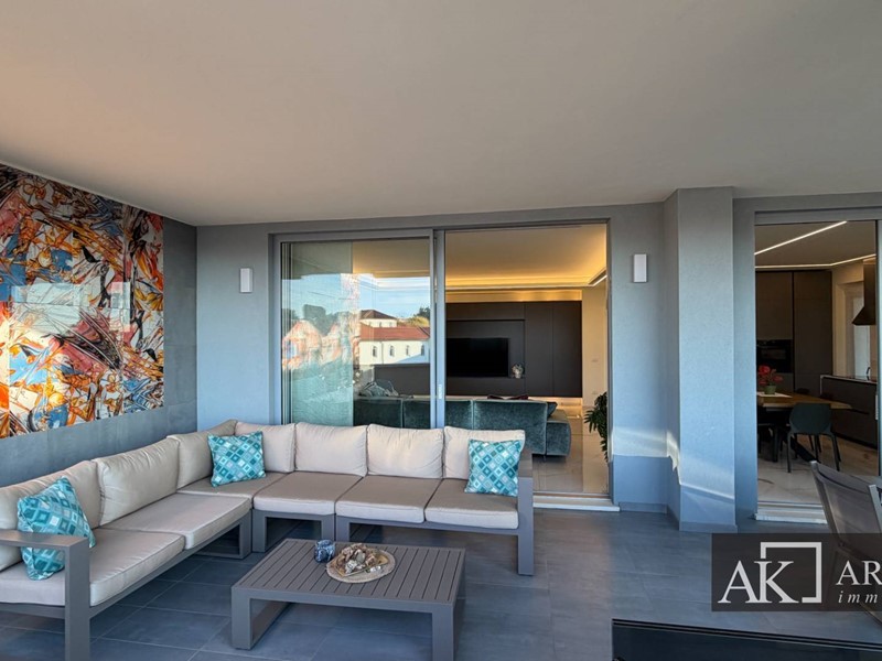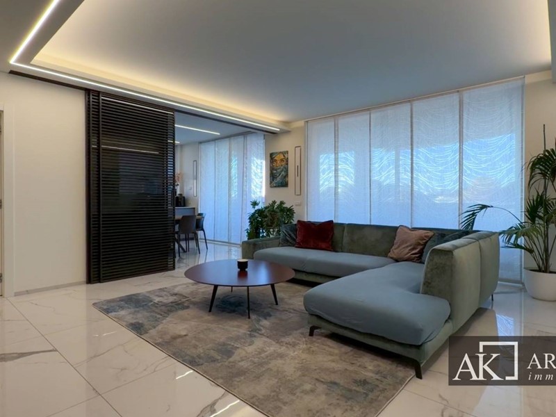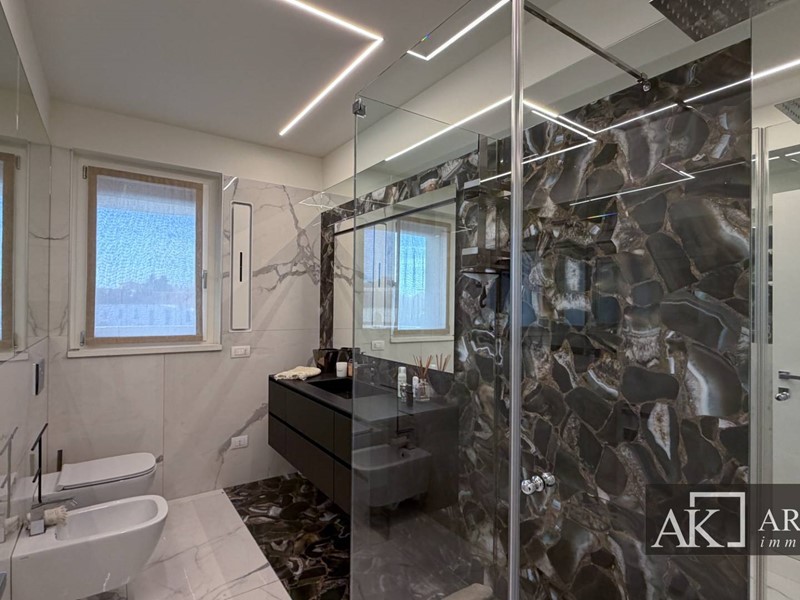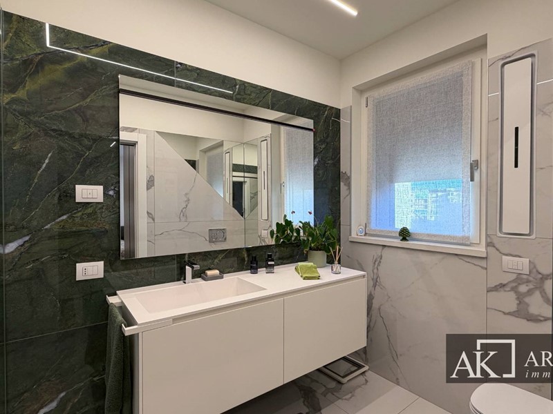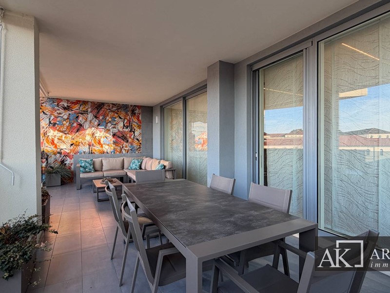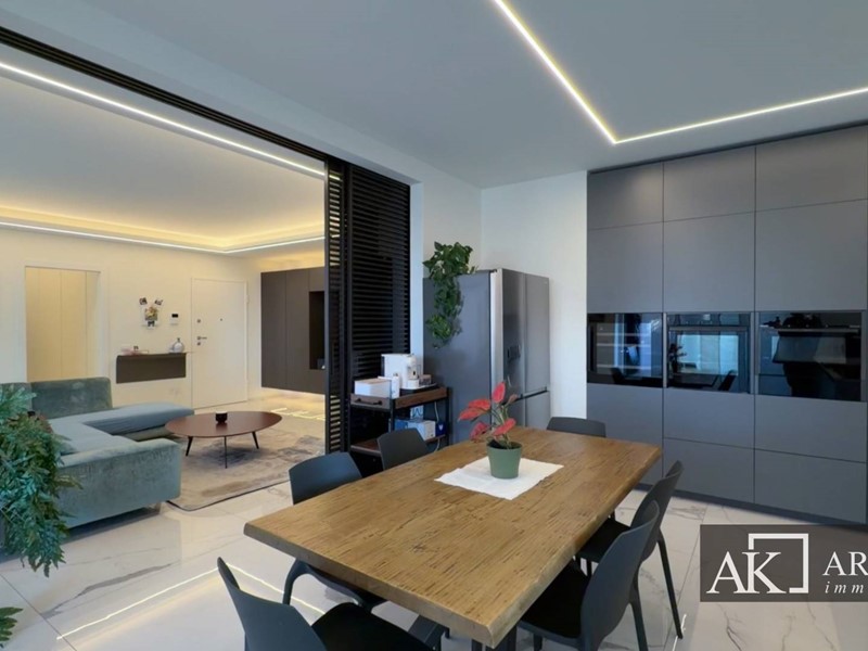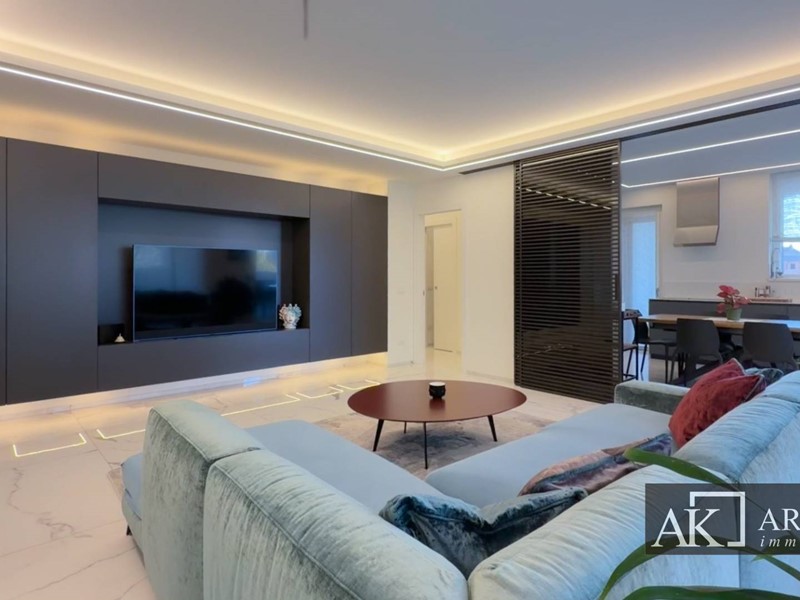 Limmobile si apre su un ampio salone con cucina a vista, separata da eleganti ante scorrevoli Rimadesio. Le grandi vetrate a tutta parete donano una luce naturale eccezionale e affacciano su uno splendido terrazzo vivibile, ideale per momenti di relax e convivialità.