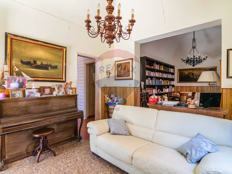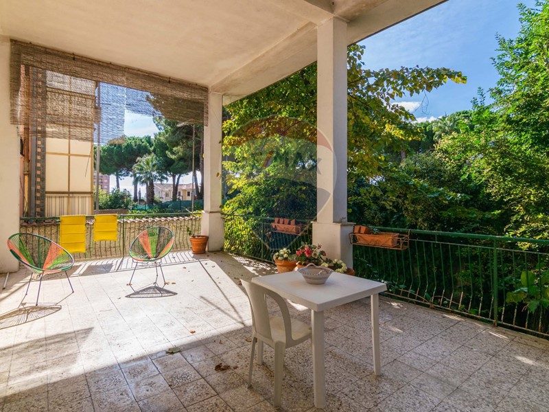 Dei due ingressi, uno di fronte all' altro, il primo a sinistra immette in un triplo salone, facilmente divisibile secondo le varie esigenze, comunicante con una ampia terrazza coperta di 3O metri quadri, ombreggiata d' Estate da due alberi, che d' inverno spogliano lasciando passare, gradevolmente i raggi del sole, e che si affaccia sul Parco della Villa comunale.