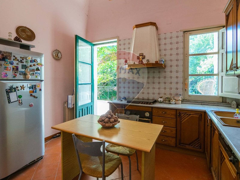 Accanto al triplice salone, abbiamo una bella cucina, piastrellata con ceramica dipinta a mano, già dotata di mobili in rovere della Jolly componibile e pavimento in cotto