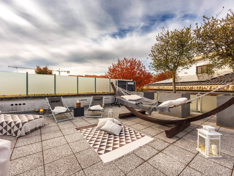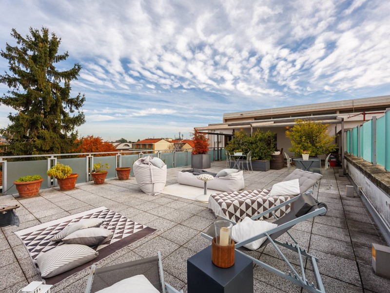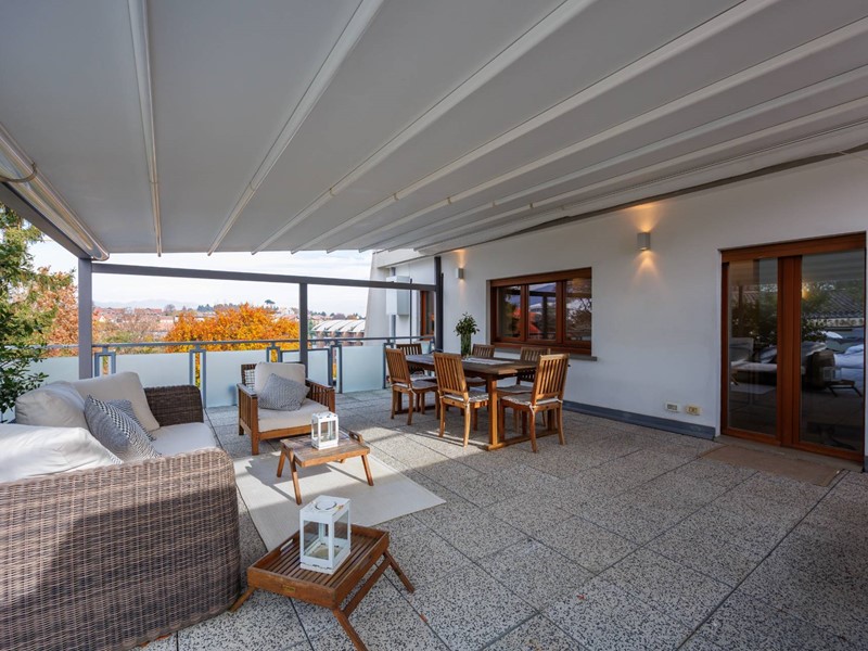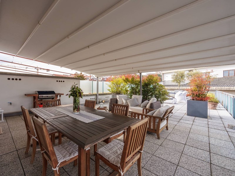 Il rooftop di 110 mq.con copertura automatizzata resistente a neve pioggia e vento diventa un vero prolungamento della casa.