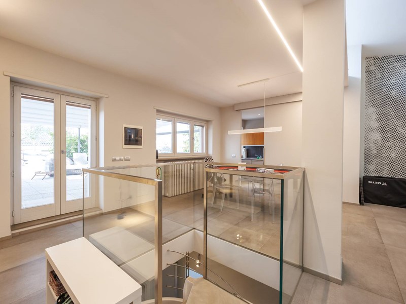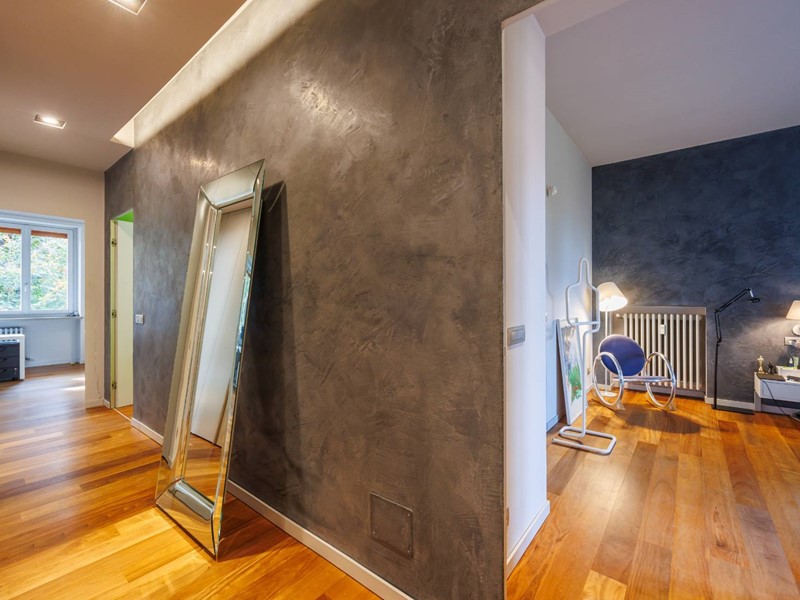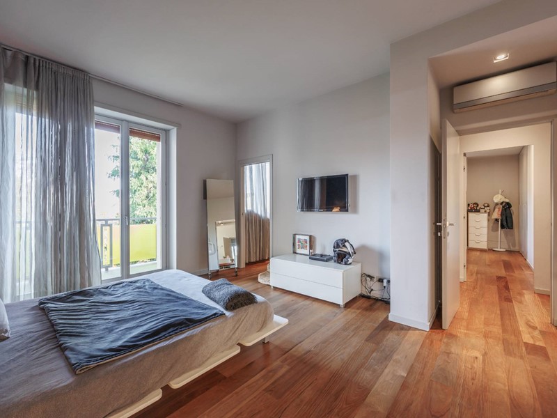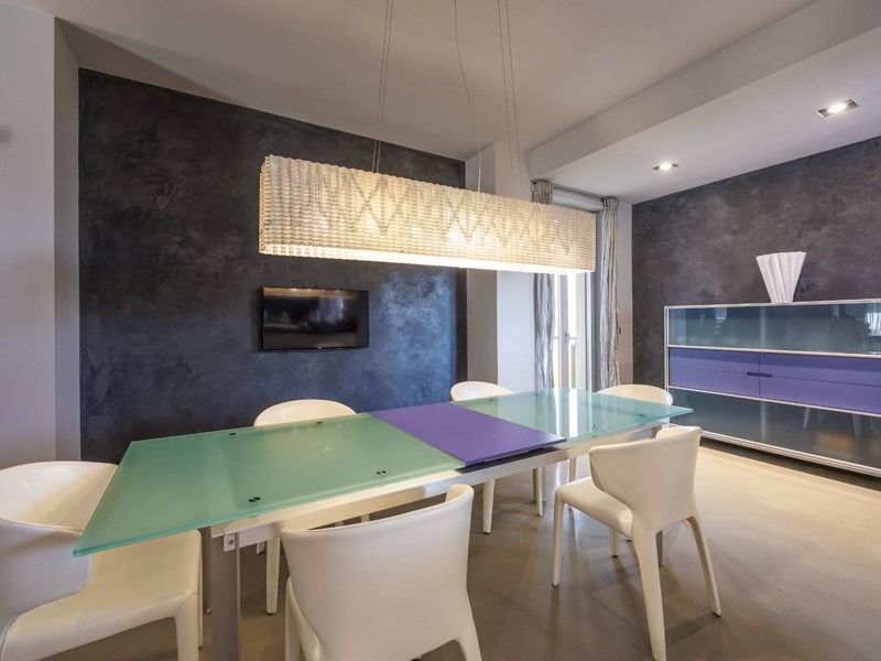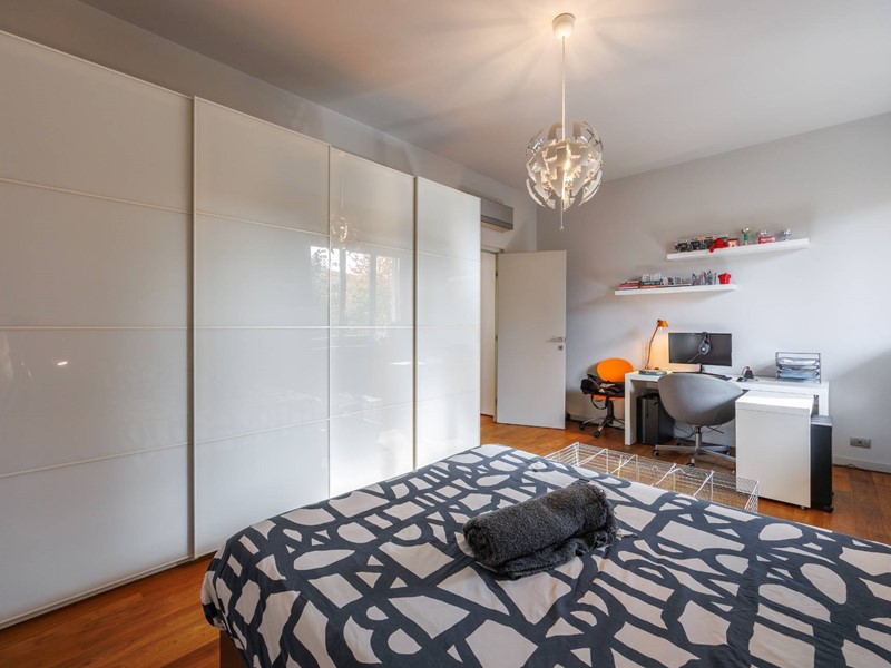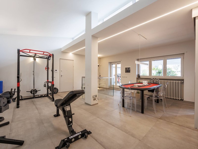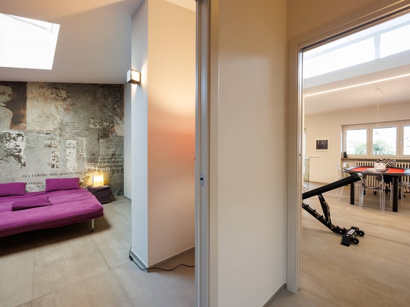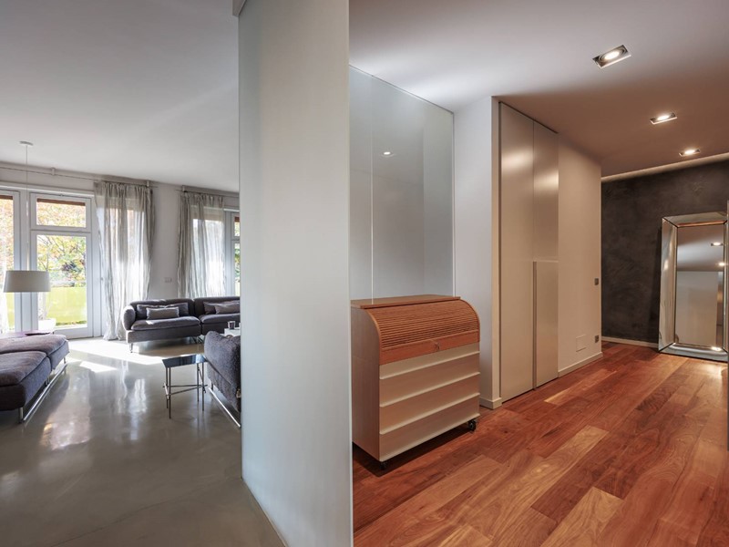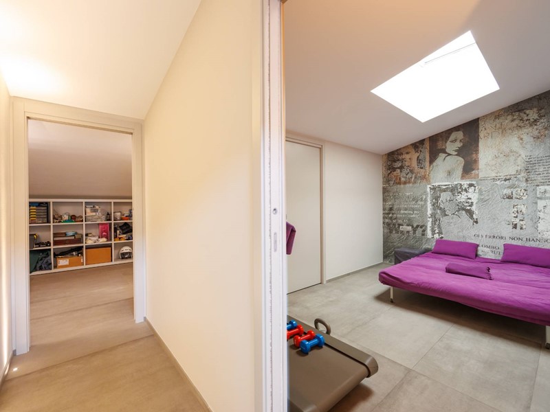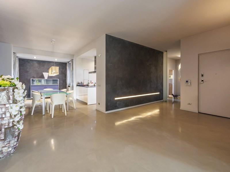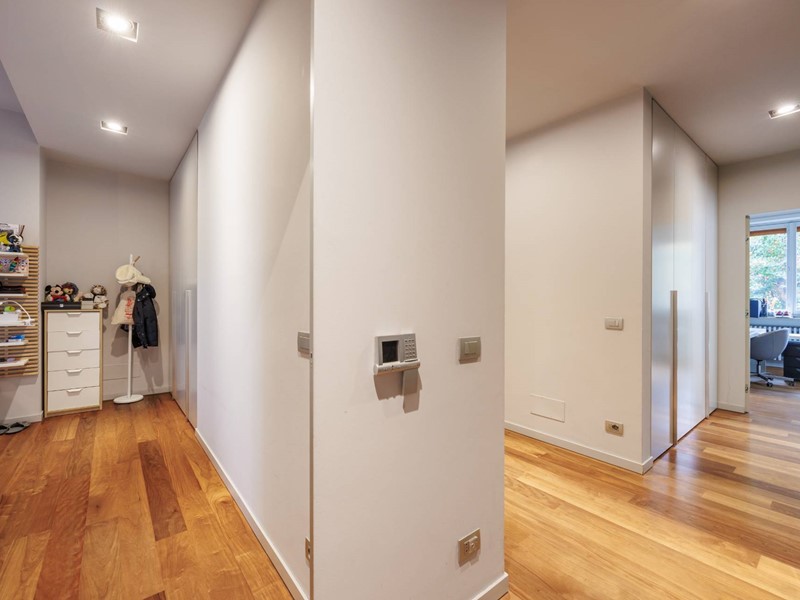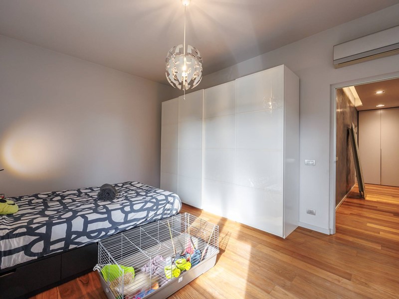 Pavimenti in resina nella zona giorno e parquet nella zona notte, arredi su misura, finiture curate, tecnologie di ultima generazione come impianto antifurto con barriere a infrarossi, porta blindata con ingresso a scheda, tapparelle elettriche con chiusura centralizzata, vetri di sicurezza e impianto di condizionamento.