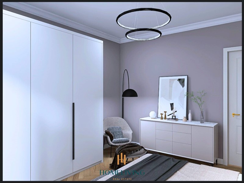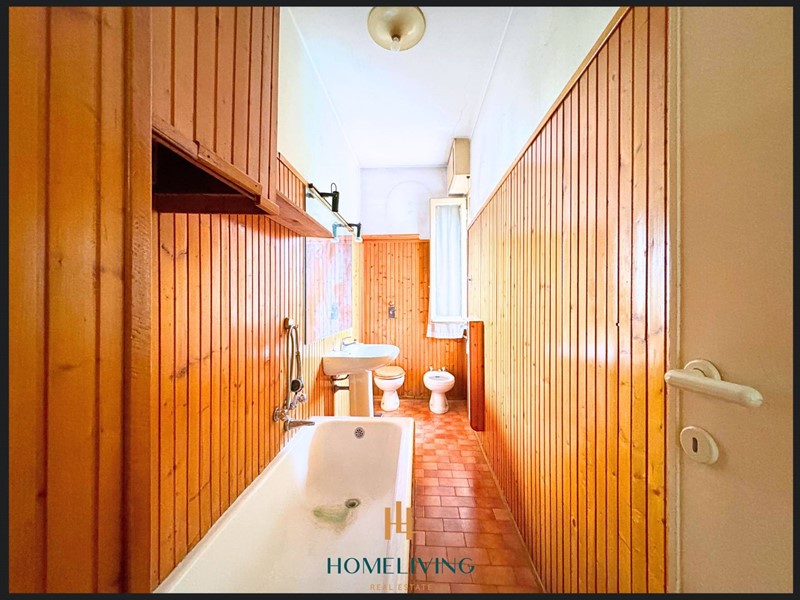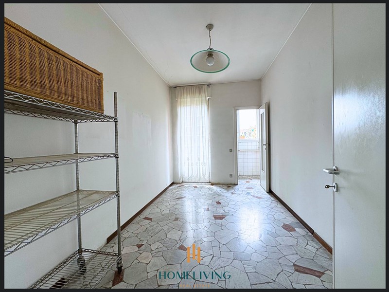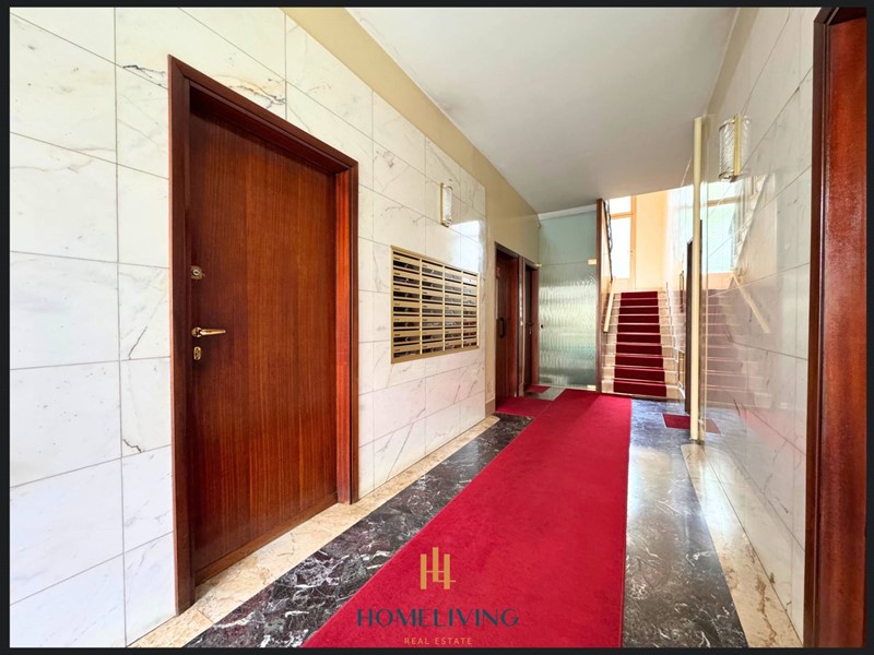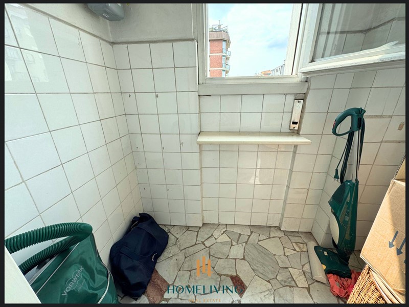 L'appartamento è composto da due ingressi, un ampio e luminoso soggiorno doppio che affaccia ad est sul balcone di proprietà, una cucina semi-abitabile separata apribile sul soggiorno,