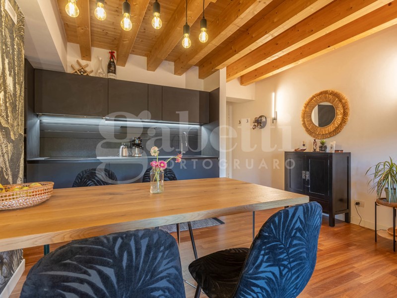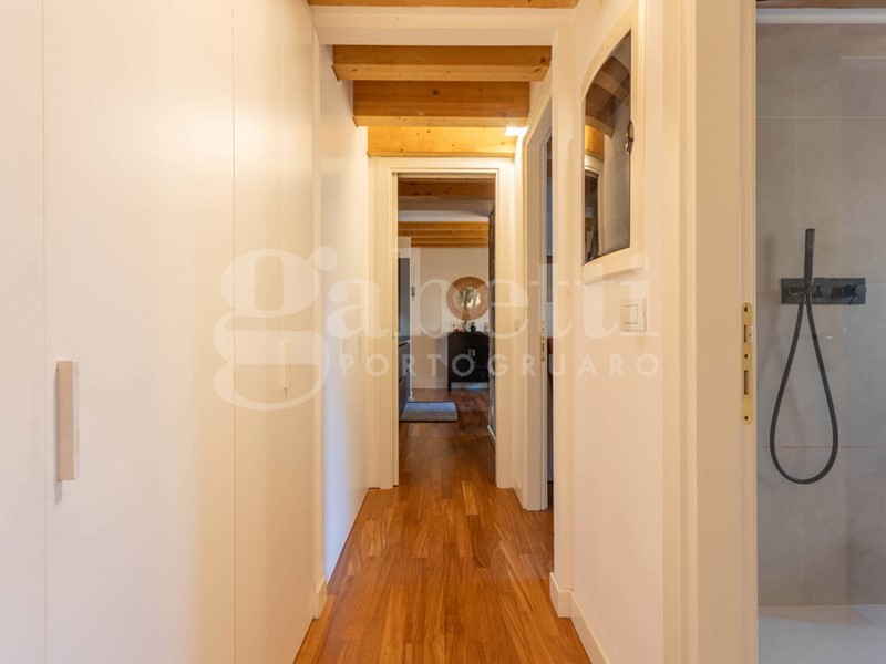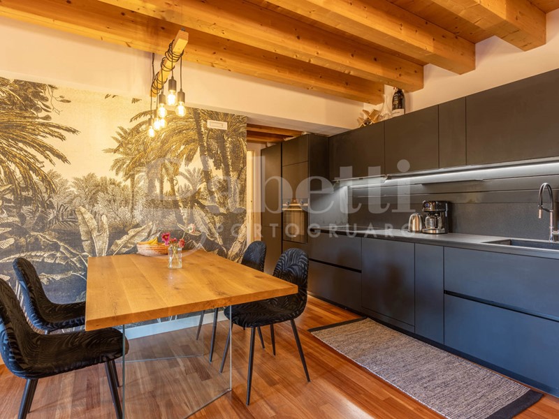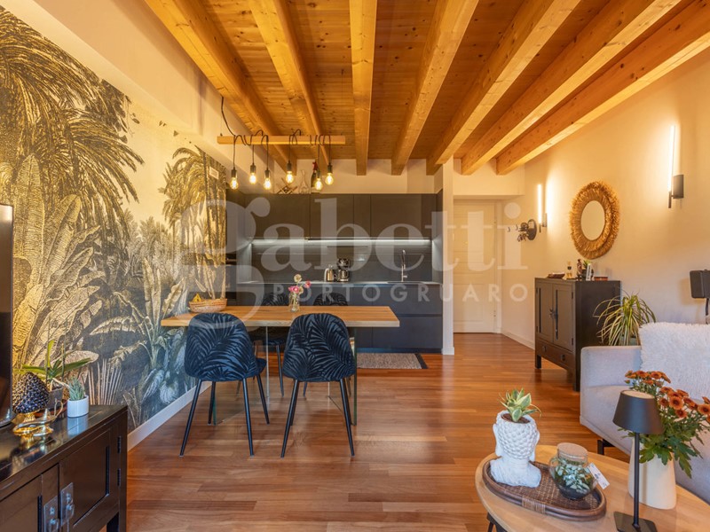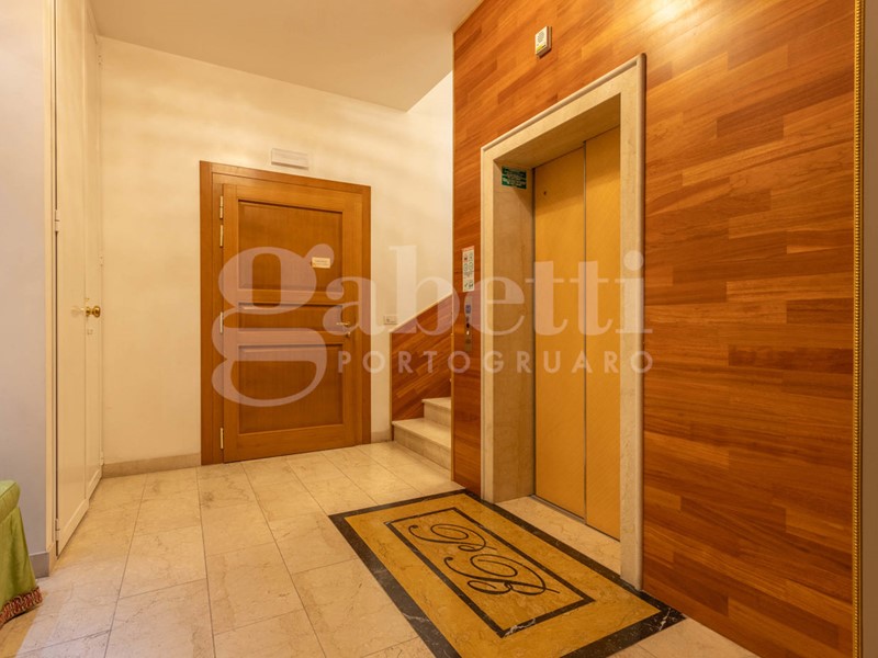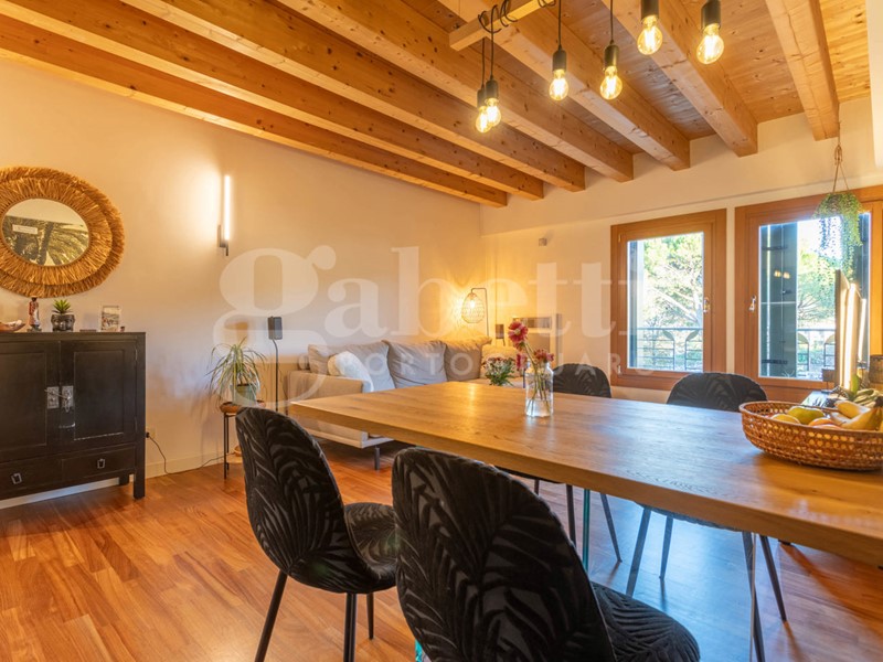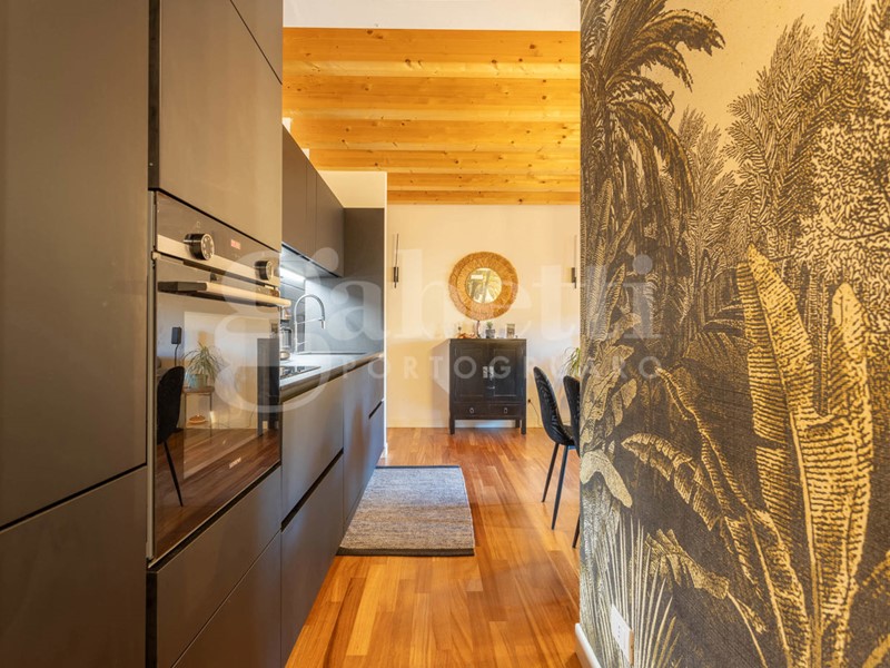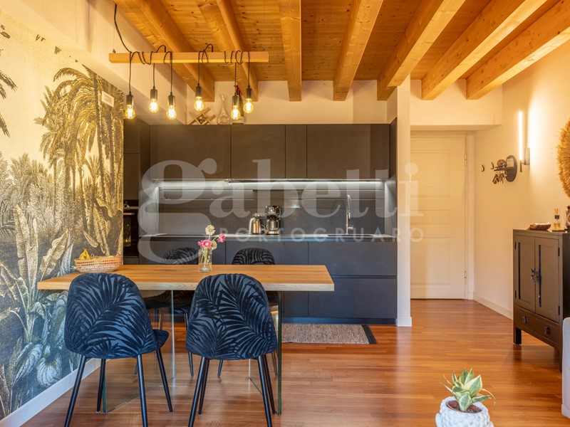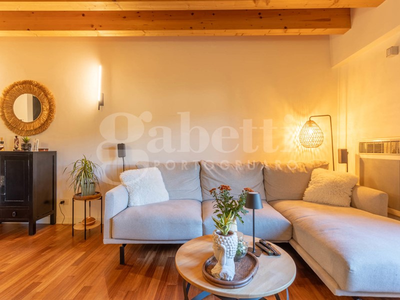 Inserito in un contesto condominiale di assoluto pregio e servito da ascensore, l'appartamento accoglie con un'atmosfera calda e raffinata, grazie alle travi a vista e alle pavimentazioni in legno che donano armonia e continuità agli ambienti.