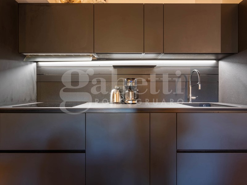 L'unità viene venduta parzialmente arredata, comprensiva di cucina e bagno completo, camera matrimoniale e armadiature su misura, arredamento ricercato e di alta qualità. Completa la proprietà un ampio garage di 26 m² al piano interrato ideale anche come ripostiglio.