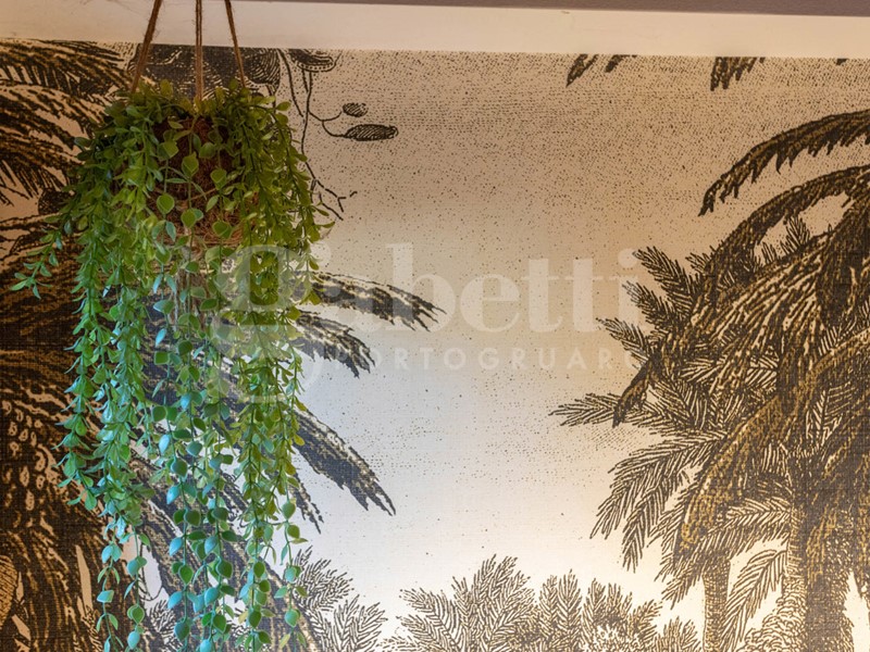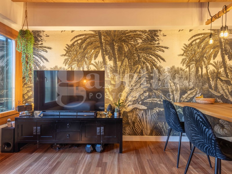 La zona giorno si sviluppa in un'unica area living con moderna cucina a vista, pensata per coniugare funzionalità e stile. Una carta da parati decorativa sulla parete principale aggiunge un tocco di personalità e design contemporaneo, rendendo l'ambiente unico e ricercato.