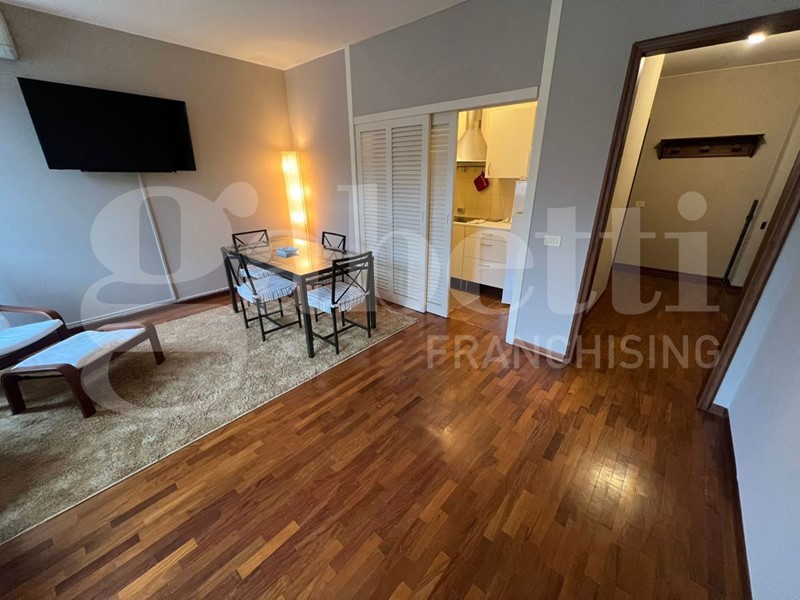 L'appartamento è composto di ingresso spazioso, pratico ripostiglio, soggiorno con affaccio sul corso, cucinino arredato, camera matrimoniale e bagno finestrato. Dispone di porta blindata, pavimento in parquet, infissi in legno con doppi vetri e teleriscaldamento.
