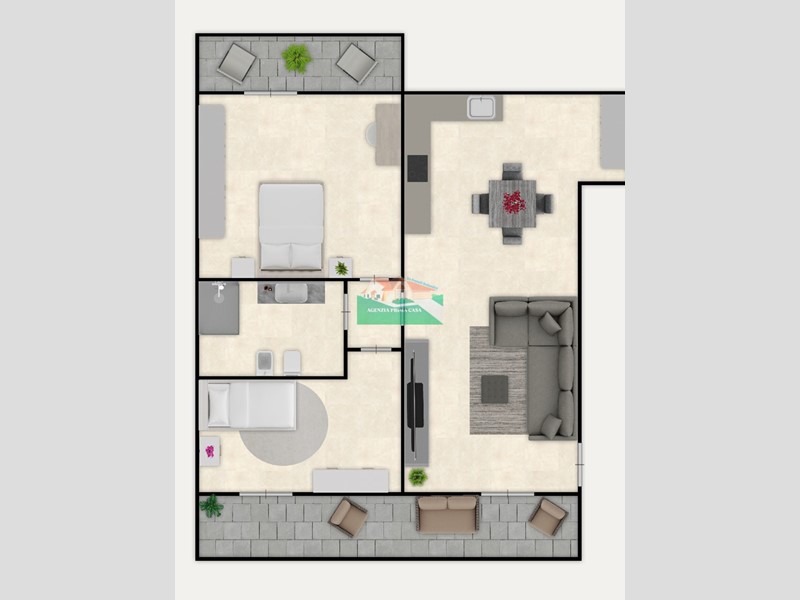 All'interno si compone da sala con angolo cottura con meraviglio terrazzo, ripostiglio, disimpegno ove si accede a 2 camere da letto (matrimoniale e singola), la matrimoniale con balcone e un bagno finestrato con doccia.