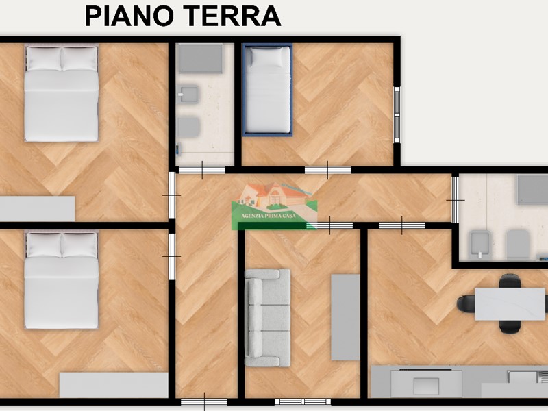 All'interno si compone da ingresso, soggiorno, cucina abitabile, 3 camere da letto (matrimoniale, doppia e singola) , bagno finestrato con box doccia.