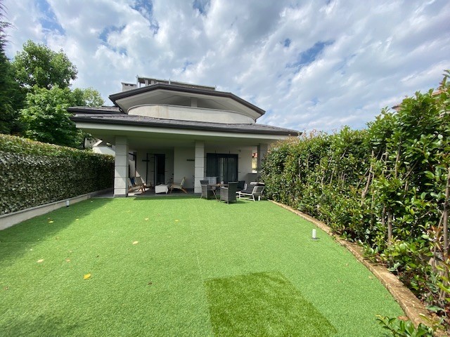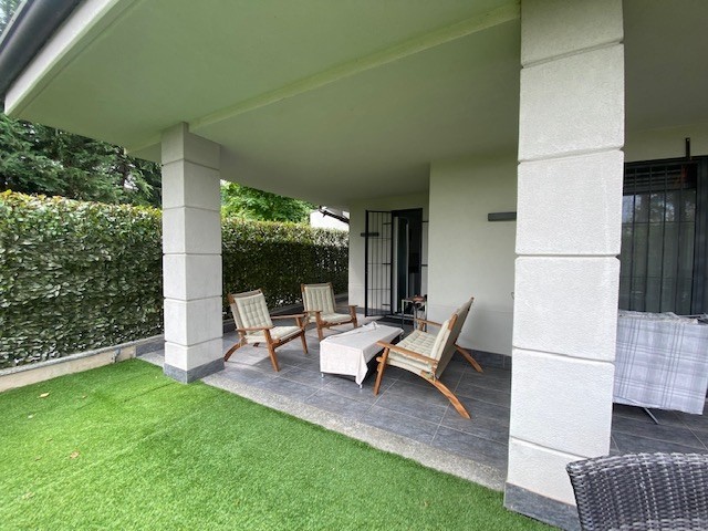 L'immobile è posto in una recentissima costruzione in classe energetica A, sita in una zona di assoluta riservatezza e a pochi minuti dal centro, L'edificio è dotato di impianto di cogenerazione combinato ad una caldaia a condensazione, riscaldamento e raffrescamento radiante a pavimento, oltre impianto di deumidificazione, impianto fotovoltaico per le parti comuni, cappotto termico, vasca per raccolta dell'acqua piovana. L'abitazione è posta al piano terra, dotata di ingresso indipendente, è suddivisa in ingresso, grande zona living con soggiorno e cucina a vista servita da giardino di 90 mq, reparto notte con camera matrimoniale e camera singola entrambe servite da una seconda area verde di 30 mq, bagno con grande doccia dotata di cromoterapia. Il piano inferiore collegato da scala interna in muratura, provvisto anche di secondo ingresso indipendente e di finestre fuori terra, è composto da seconda zona relax / salotto, locale lavanderia, bagno con doccia anch'essa con cromoterapia, ripostiglio e cabina armadio. L'immobile è accessoriato di inferiate su tutte le finestre, tapparelle in alluminio motorizzate e serramenti in PVC a ribalta marca Fossati colorazione bianco, allarme volumetrico e perimetrale, porte d'arredo Luxor raso muro, impianto elettrico con placche BTicino serie axolute air, controsoffitti con faretti led, luci a led sul perimetro del pavimento dei bagni e della parete scala, giardino con prato sintetico di alta qualità dotato di impianto di irrigazione. Box con basculante motorizzate e con impianto d'allarme, oltre posto auto interno. \nL'immobile viene affittato parzialmente arredato (ad esclusione della taverna). ***IMMOBILE LIBERO DAL 01/01/2026***\nContratto ad uso abitativo 4+4, sei mesi anticipati, spese condominiali fisse pari a euro 2.000 annue non comprese nel canone d'affitto.\nLa proprietà richiede persone altamente referenziate. NO ANIMALI DOMESTICI.\n - Maggiori Dettagli: Climatizzato, Porta blindata, Sistema di allarme