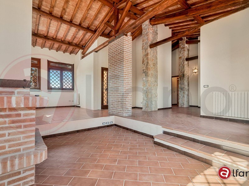 All'interno, un ampio e caloroso soggiorno accoglie con un bellissimo camino in pietra, cuore della casa e luogo dove far convergere gli affetti e le conversazioni.