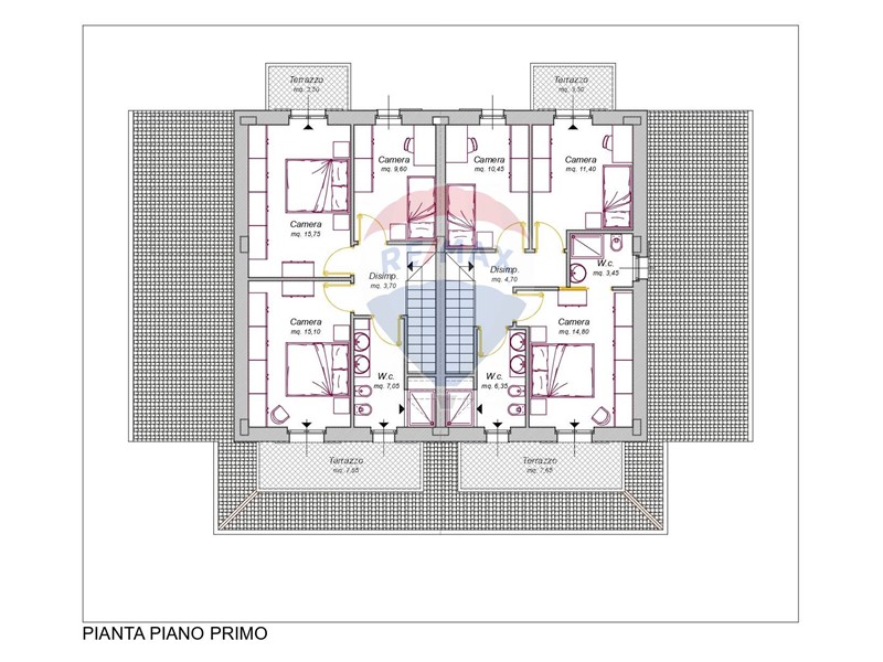 Al Piano primo: tre camere matrimoniali, bagno, disimpegno, n.2 terrazze.