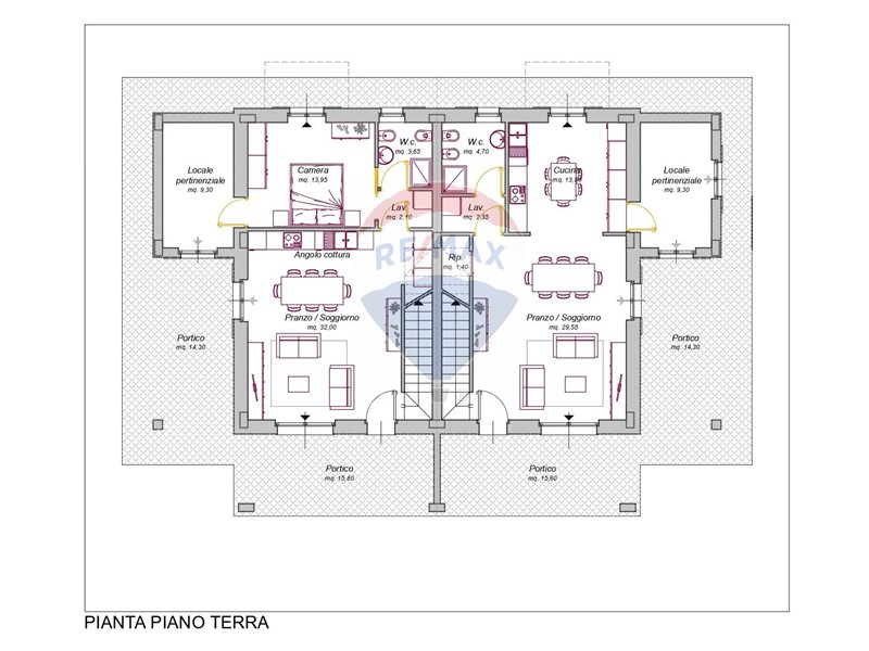 Ogni porzione di bifamiliare si sviluppa su due livelli ed è composta al piano terra: soggiorno, cucina, disimpegno, bagno, n.1 portico, locale pertinenziale, corte esclusiva.