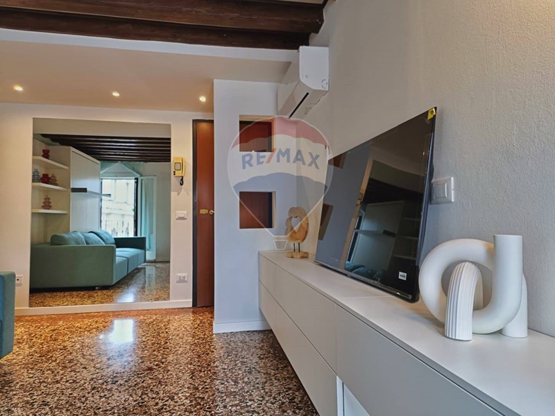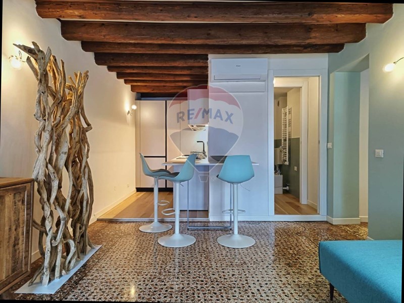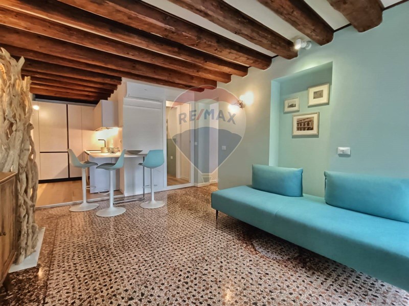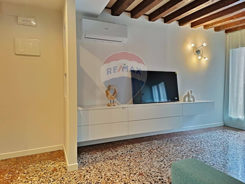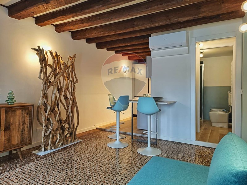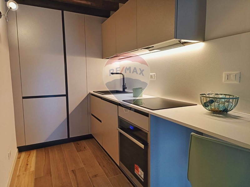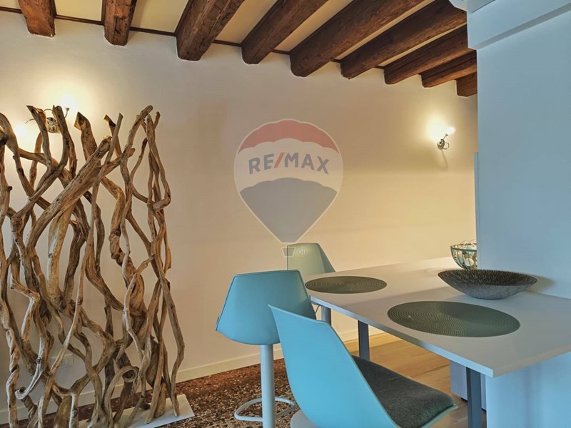 La zona giorno è ampia e luminosa, con travi a vista ripulite e pavimentazione veneziana restaurata; la cucina, moderna e attrezzata, offre soluzioni di design con piano a induzione e lavastoviglie integrata.