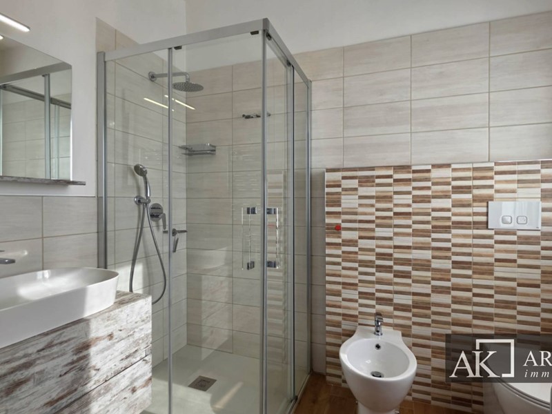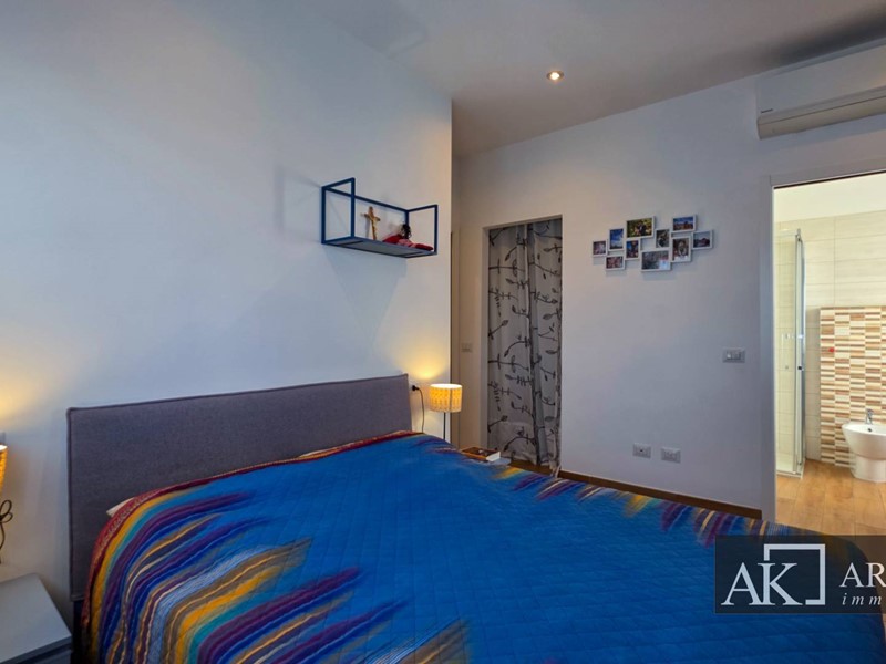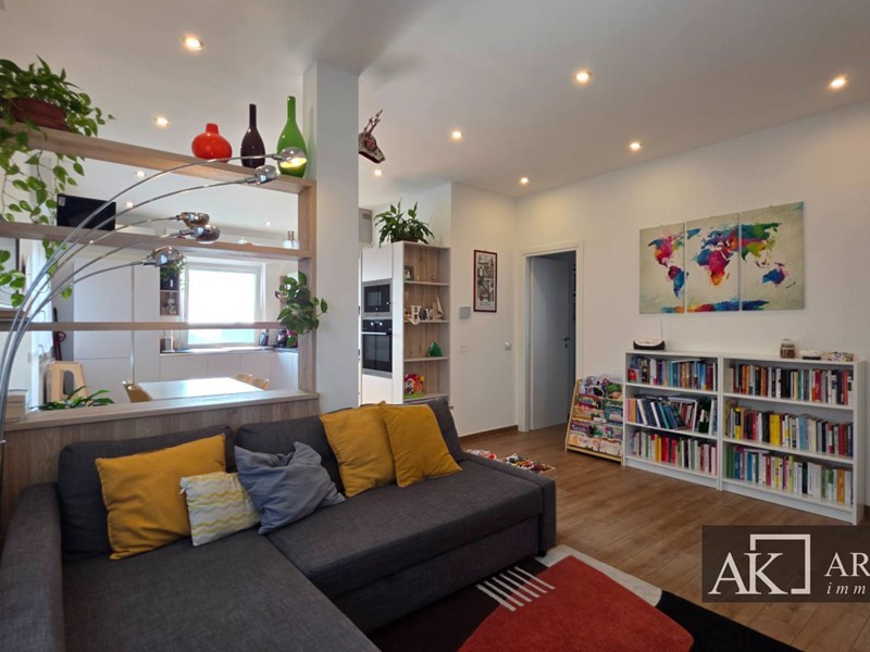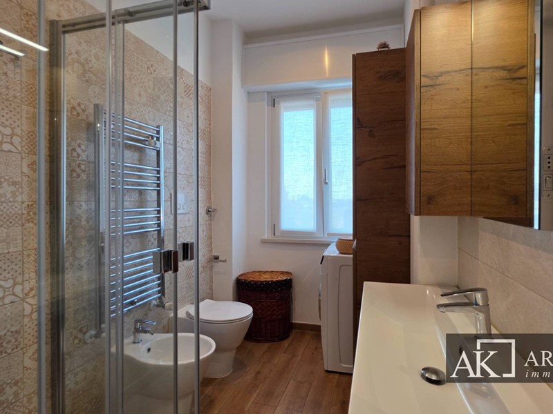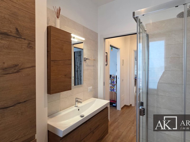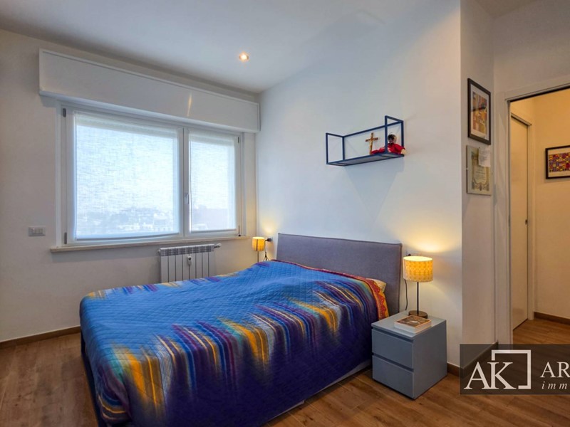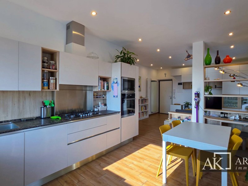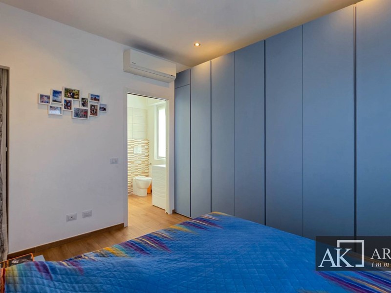 Lappartamento è composto da un ampio soggiorno con cucina a vista, due camere da letto, due bagni, di cui uno privato nella camera matrimoniale, piccola cabina armadio e due balconi.