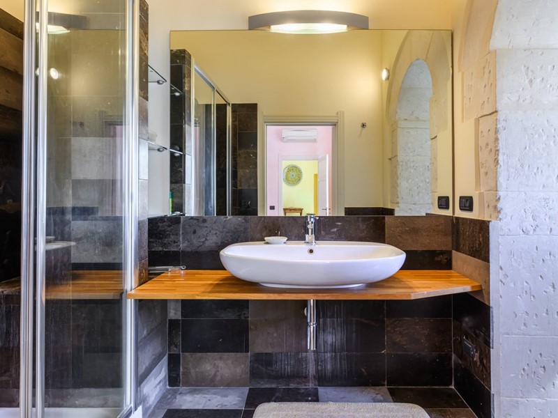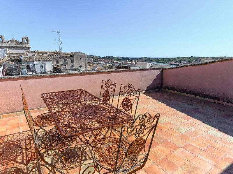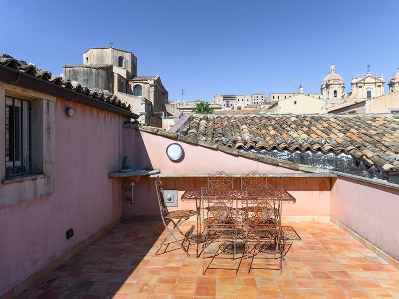 Una scala di design moderno conduce infine al terrazzino panoramico, un autentico gioiello che offre una vista incantevole sui capolavori barocchi di Noto e uno scorcio di mare che allorizzonte si fonde con il cielo.