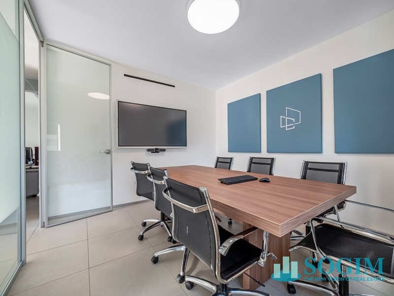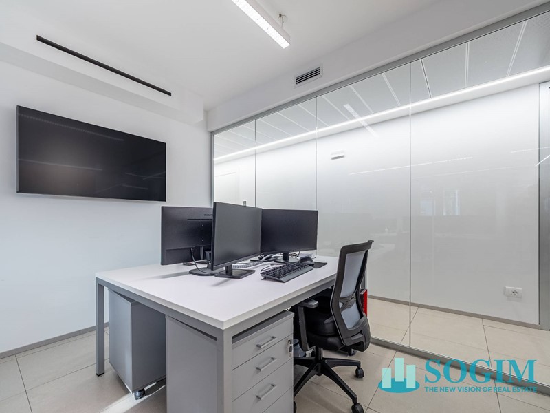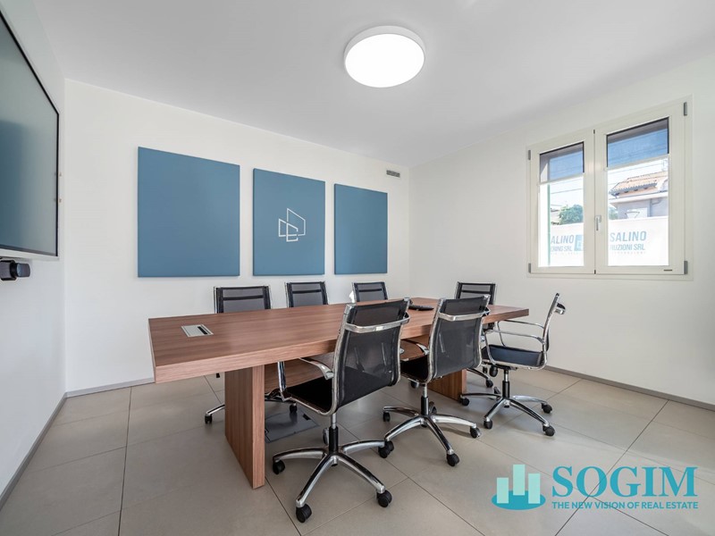 Gli spazi interni dell'ufficio sono ben articolati, una volta entranti nell'accogliente reception si trova un 'ampia sala riunioni divisa da pareti a vetro che consentono il passaggio della luce naturale. Superato l'ingresso sono presenti 3 sale ufficio, un'altra sala riunioni, un comodo ripostiglio, 3 servizi e una funzionale cucina/zona snack.