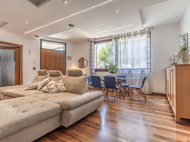 Lingresso si apre su un portico che conduce a un soggiorno molto spazioso con caminetto, ideale per la vita familiare. A seguire troviamo una cucina abitabile con comodo ripostiglio e un secondo accesso che porta alla scala interna e al garage di circa 31 mq.