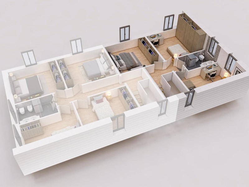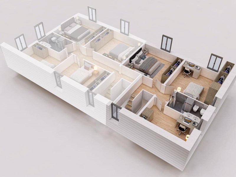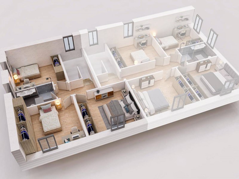 - Piano primo: tre camere da letto, bagno e disimpegno