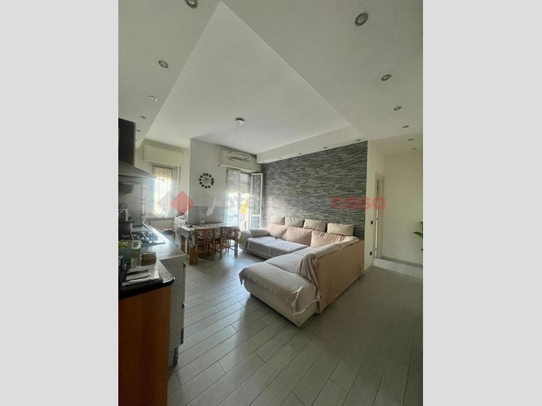 ingresso su ampia zona giorno con cucina a vista, dove è possibile accedere ad un comodo balcone; due camere matrimoniali e bagno finestrato.