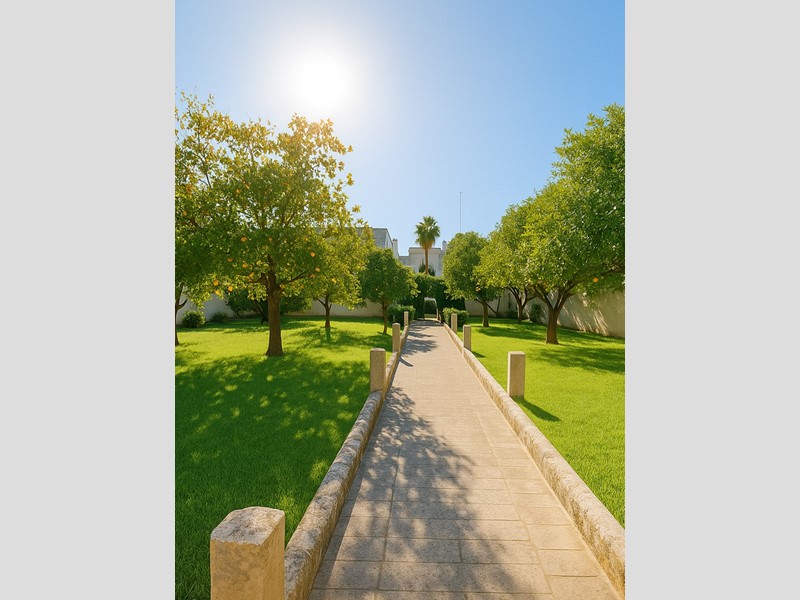 Varcando il cancello, ci si ritrova in un piccolo mondo privato: un grande giardino, un frutteto e un agrumeto, spazi ampi che evocano la libertà di vivere all’aperto, tra profumi mediterranei e silenzi interrotti solo dal canto degli uccelli.