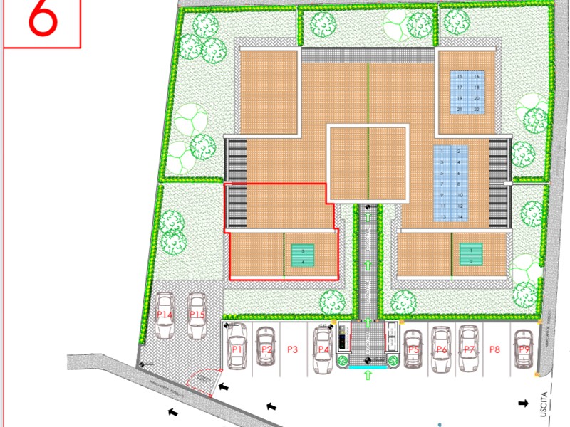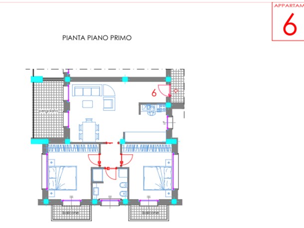L'appartamento "6" è sito al primo piano ed è così composto: ingresso, soggiorno con angolo cottura con accesso a pergolato, disimpegno, camera matrimoniale, cameretta, bagno dotato di finestra. Al piano superiore troviamo un soppalco con affaccio sulla zona giorno. Completa la proprietà un posto auto. Classe energetica A++ grazie all'impianto fotovoltaico, pannelli solari, impianto di riscaldamento a pavimento, coibentazioni. Consegna giugno 2026, possibilità di ampie personalizzazioni e scelta del capitolato.