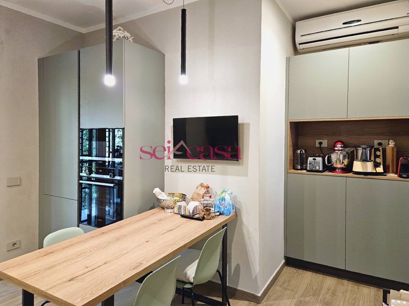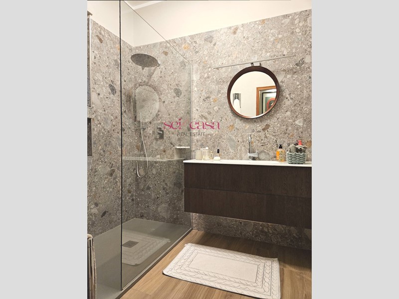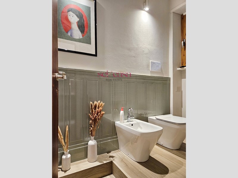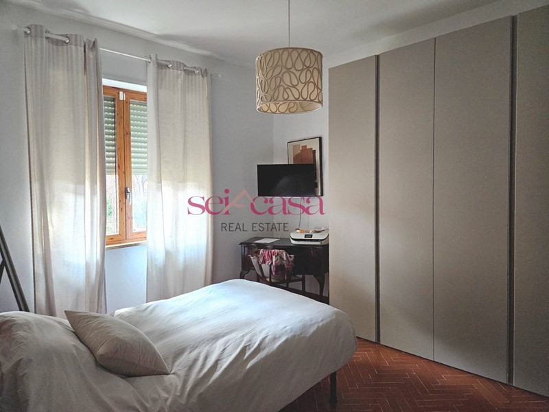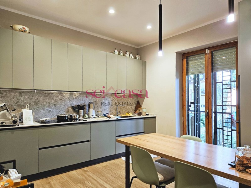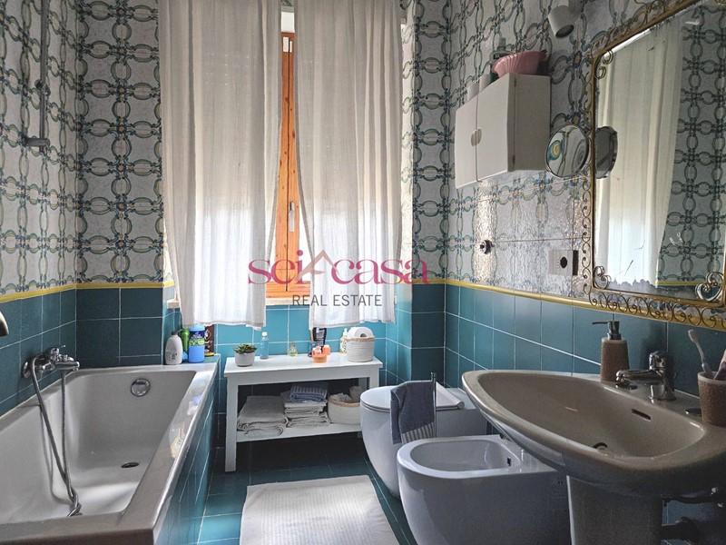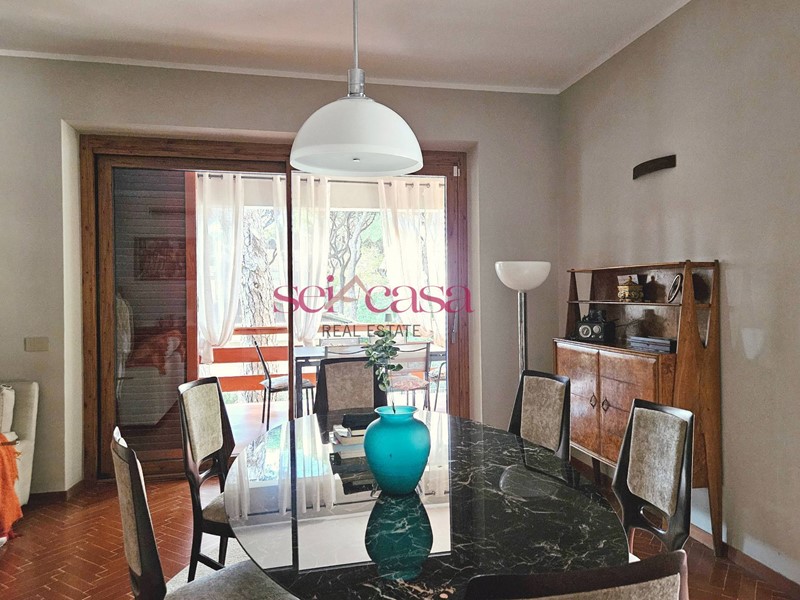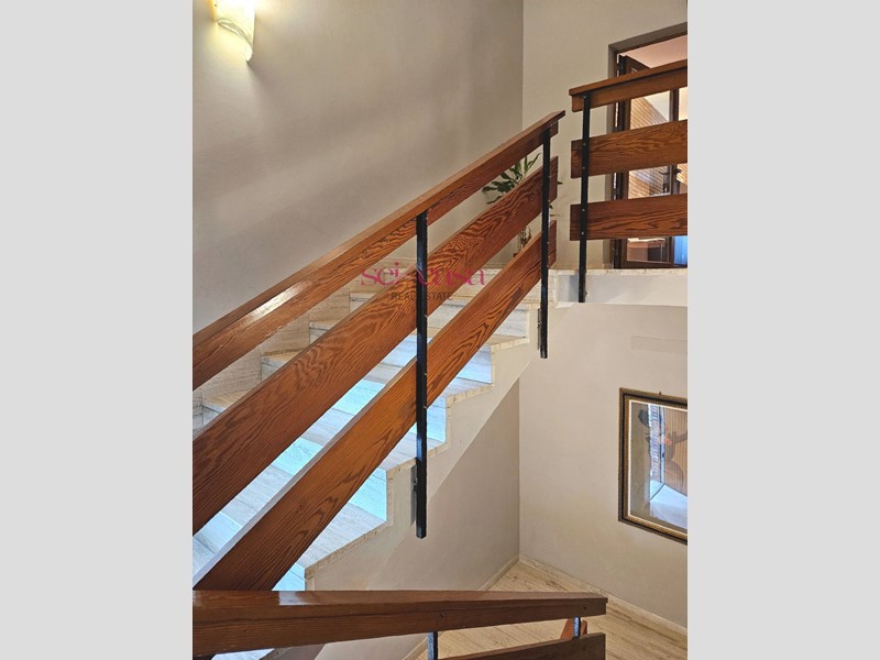 La cucina, anch'essa completamente arredata, è separata dal soggiorno e dispone di un comodo spazio per il pranzo ed è dotata di uno spazioso balcone di servizio verandato utile anche come spazio lavanderia. Dal soggiorno si accede alla zona notte composta da un ampio corridoio che conduce alle camere da letto, spaziose e ben illuminate, due matrimoniali ed una singola, un bagno con vasca piastrellato con piastrelle di Vietri. Un secondo grande bagno con doccia serve la zona giorno. L'appartamento è dotato di ogni comfort, tra cui aria condizionata, riscaldamento autonomo e impianto di allarme. Si presenta in ottime condizioni con rifiniture di pregio, pavimenti in cotto, doppi vetri alle finestre, bellissime porte, faretti incassati nel muro e nelle cornici al soffitto. Bella anche la scala che conduce al piano e al piano seminterrato dove si trova la cantina di grandi dimensioni per riporre oggetti e attrezzature. La casa presenta un bel giardino con piante ornamentali e ben curato.