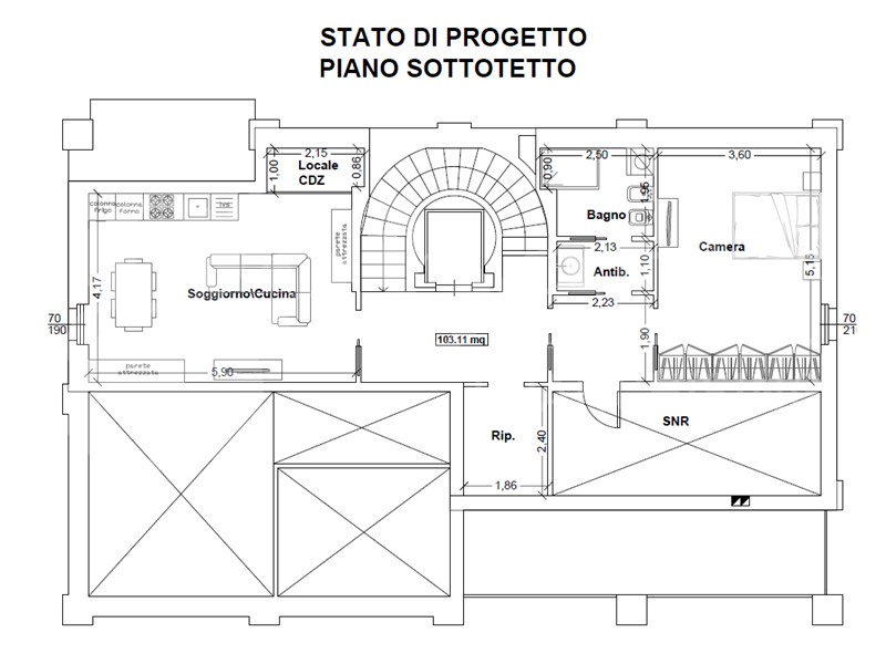 L'appartamento "D" posto al piano SOTTOTETTO è così composto: ingresso nell'ampio e luminoso soggiorno con cucina a vista, camera matrimoniale, antibagno, bagno e ripostiglio.