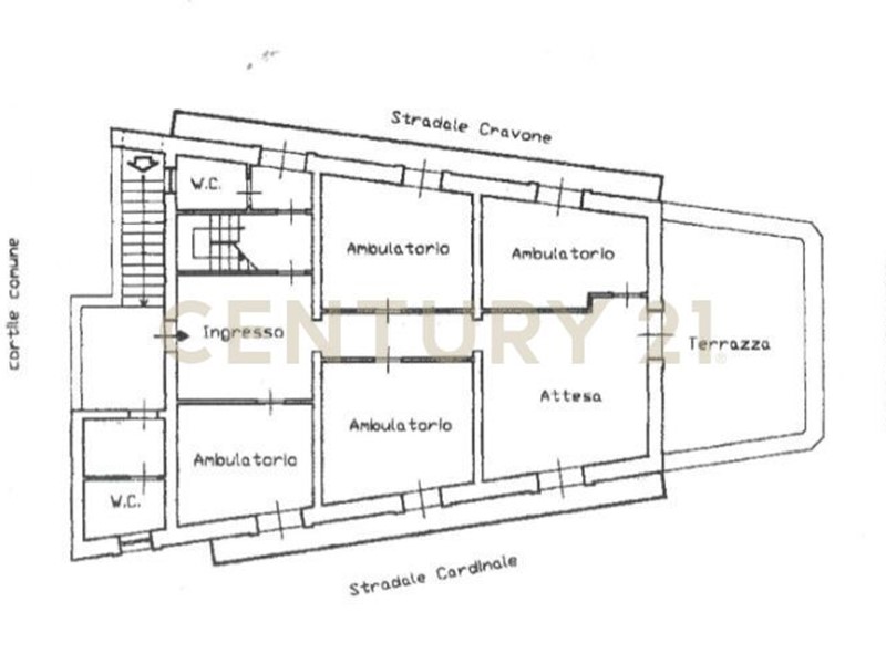 L’immobile, in buone condizioni, si presenta con ingresso disimpegnato, sala d’attesa, tre ambulatori/studi professionali, due bagni, terrazzino di circa 30 mq e due balconi paralleli che garantiscono ottima luminosità. Completa la proprietà un locale archivio posto al secondo piano.
