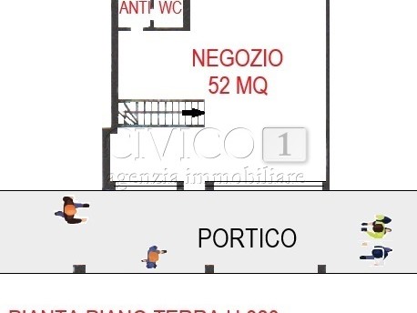 Ampia vetrina sotto portico pedonale con forte visibilità