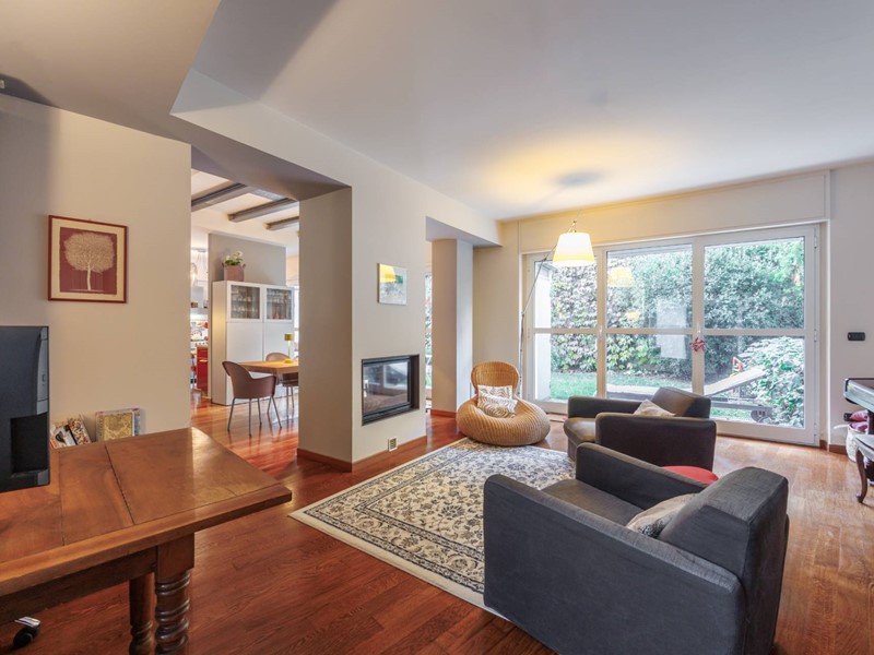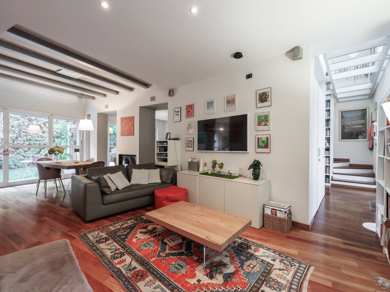Al piano terra lingresso si apre su unampia e raffinata zona giorno, caratterizzata da grandi vetrate che affacciano direttamente sul giardino