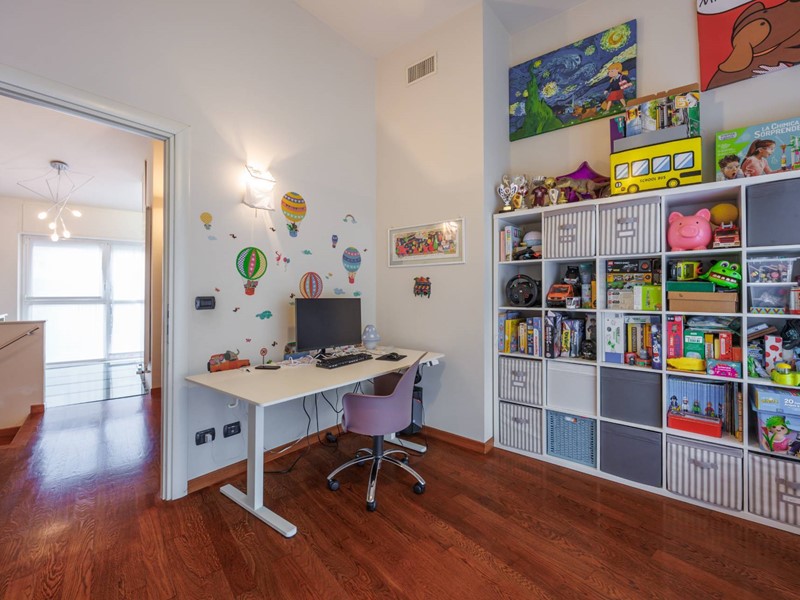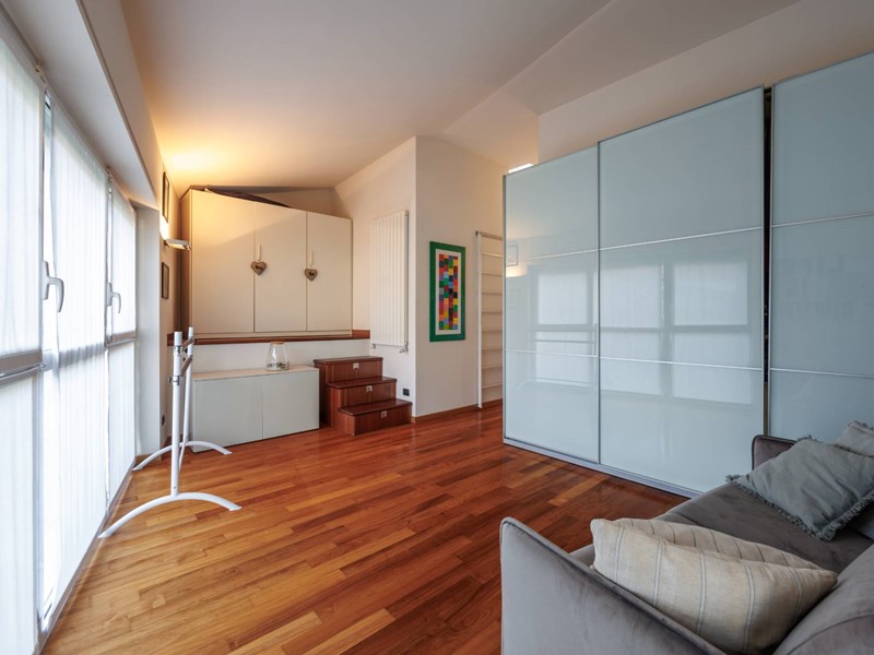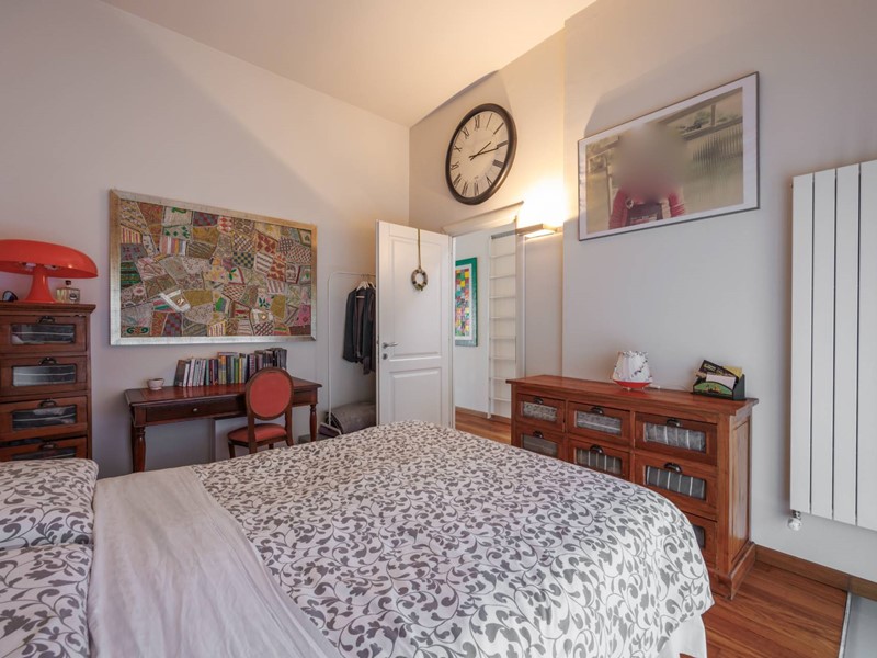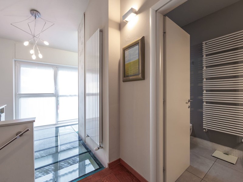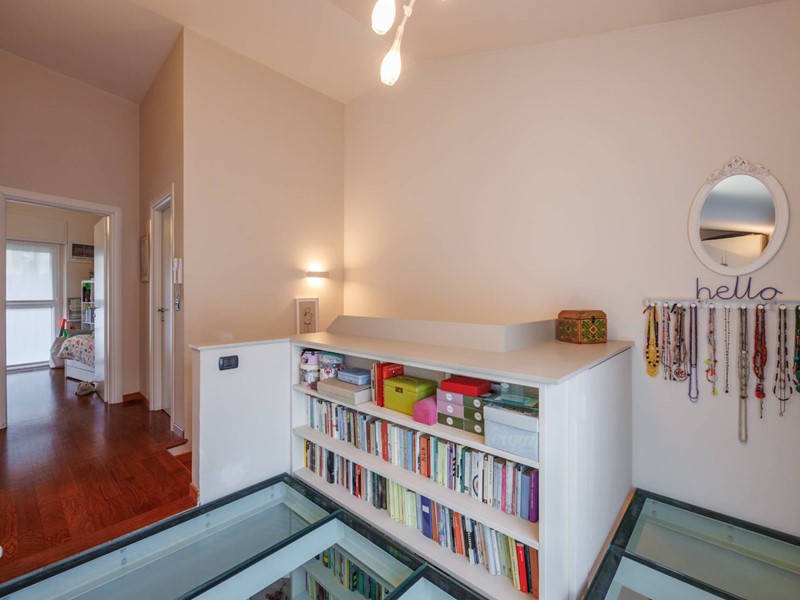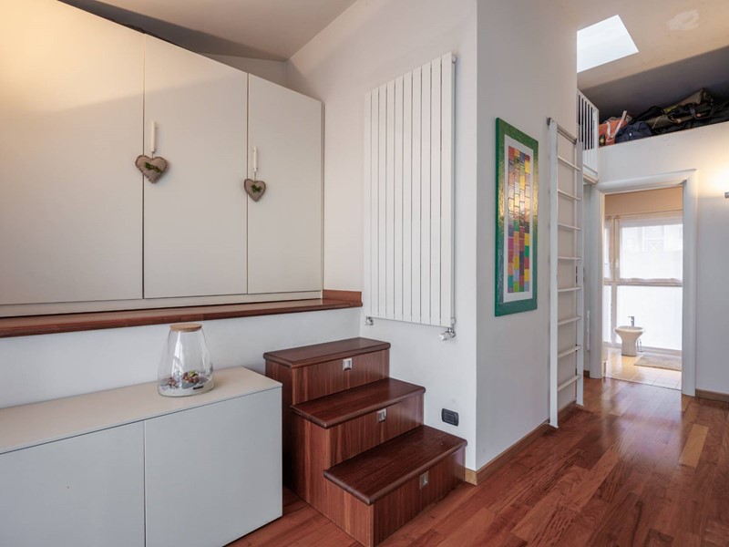 Due scale collegano il piano superiore composto da due camere da letto, entrambe luminose e silenziose, una stanza armadio dedicata, collegata alla camera principale e facilmente trasformabile in terza camera, due bagni di cui uno finestrato e un due ripostigli.