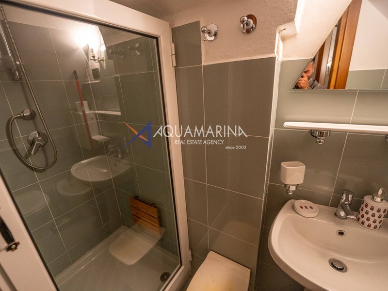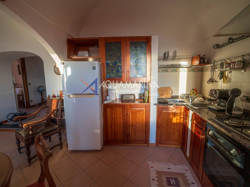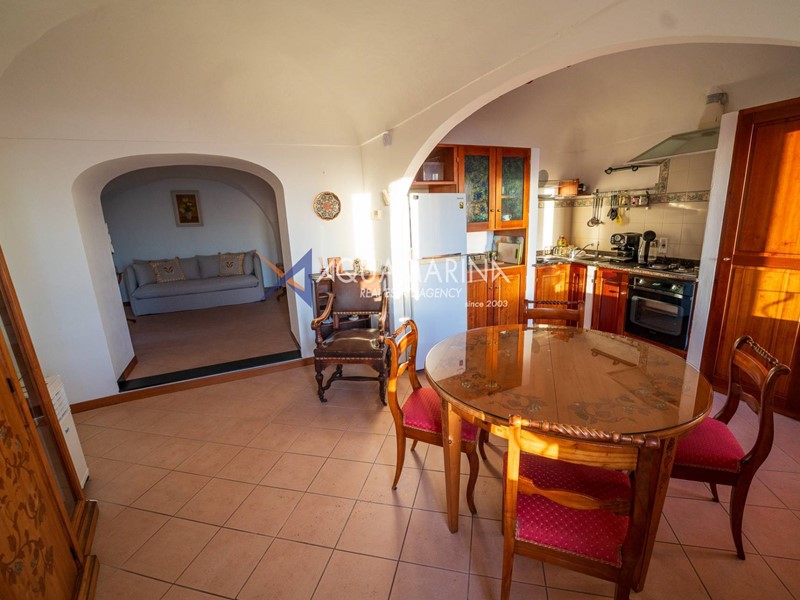 Lingresso al piano terra accoglie con un portone blindato e conduce a una confortevole camera matrimoniale e a un bagno dalle finiture curate. Al piano superiore si apre un ambiente luminoso e armonioso, con sala da pranzo e cucina abitabile esposta a Sud, affacciata sul mare attraverso due ampie finestre che inondano gli spazi di luce naturale. Una terrazza coperta con vetrate apribili permette di vivere tutto lanno la vista sul mare, mentre la seconda camera matrimoniale, dotata di armadio a muro, e il secondo bagno completano il livello.