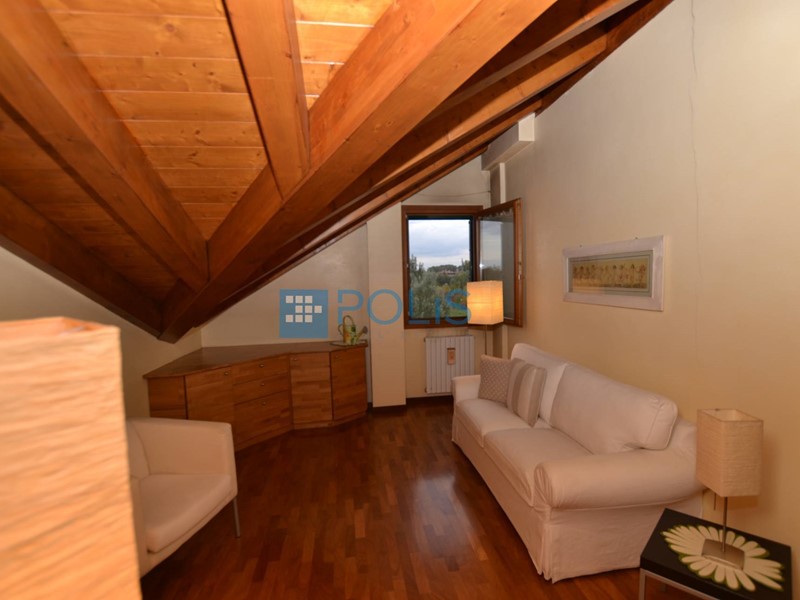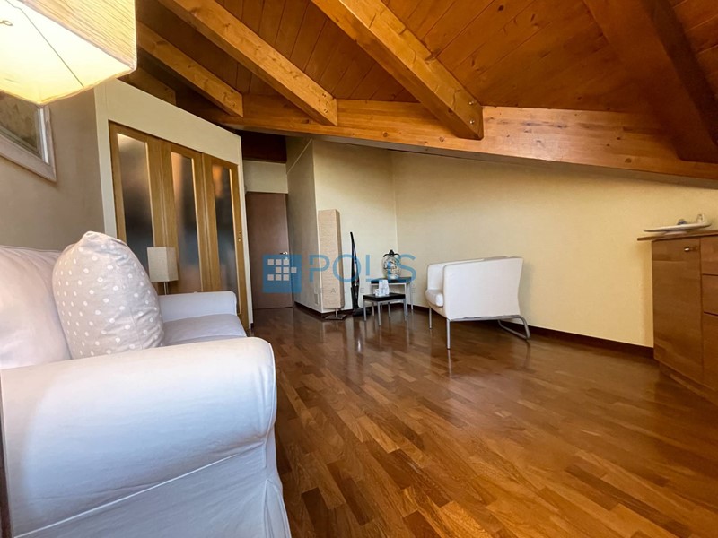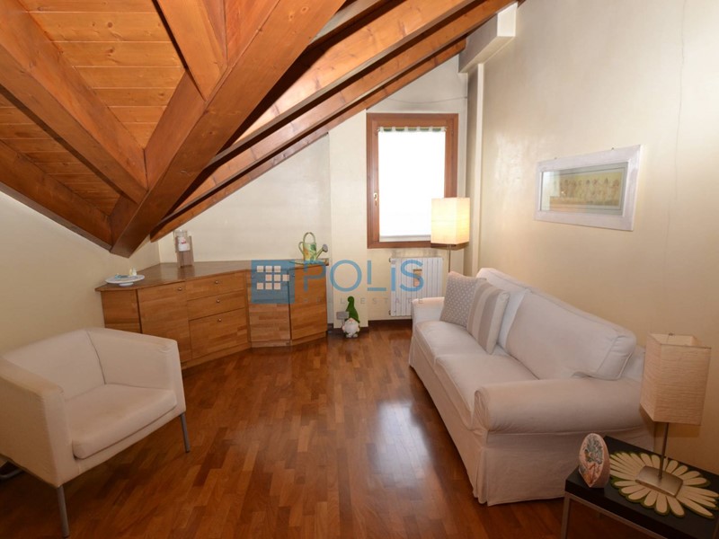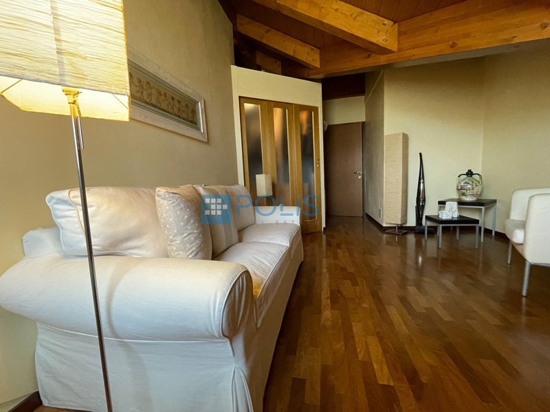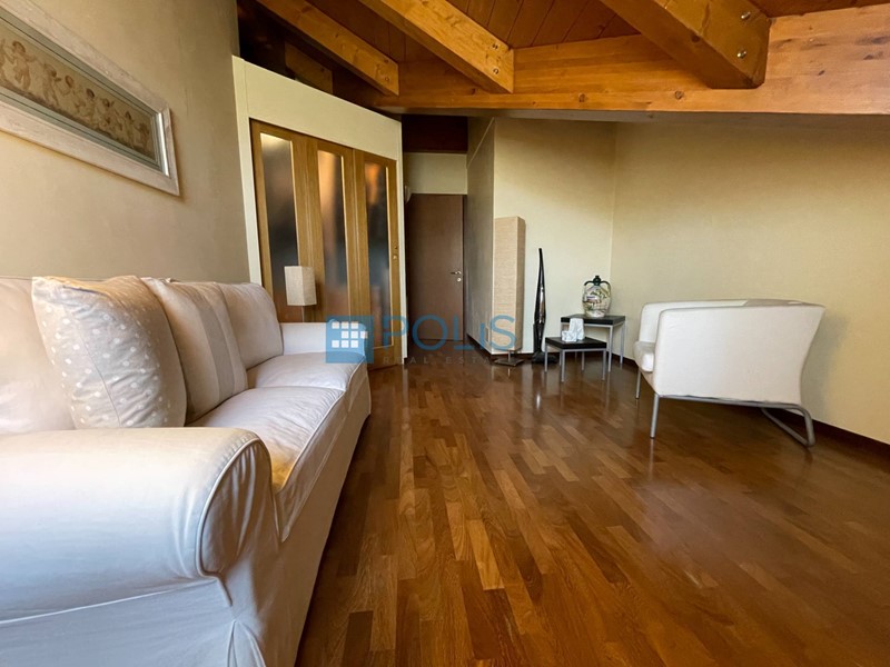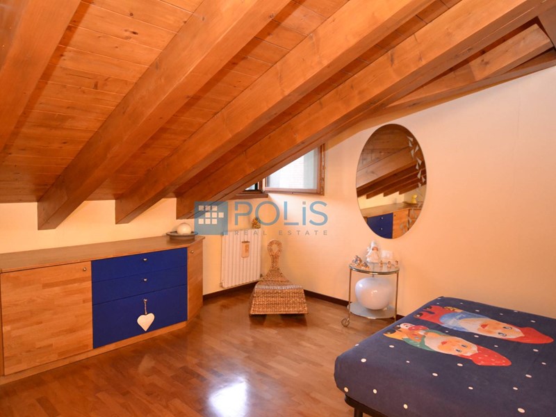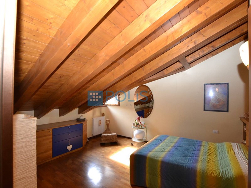 Al piano superiore, un suggestivo ambiente mansardato con travi in legno a vista offre spazi versatili e confortevoli, due stanze, due bagni e una pratica cabina armadi.