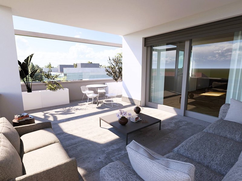APPARTAMENTO N° 3: Appartamento al primo piano di quattro locali con doppi servizi di 142 mq con terrazzo coperto di 27 mq e balcone di 14 mq.In elegante mini palazzina di 9 unità abitative, proponiamo appartamento con tripla esposizione.