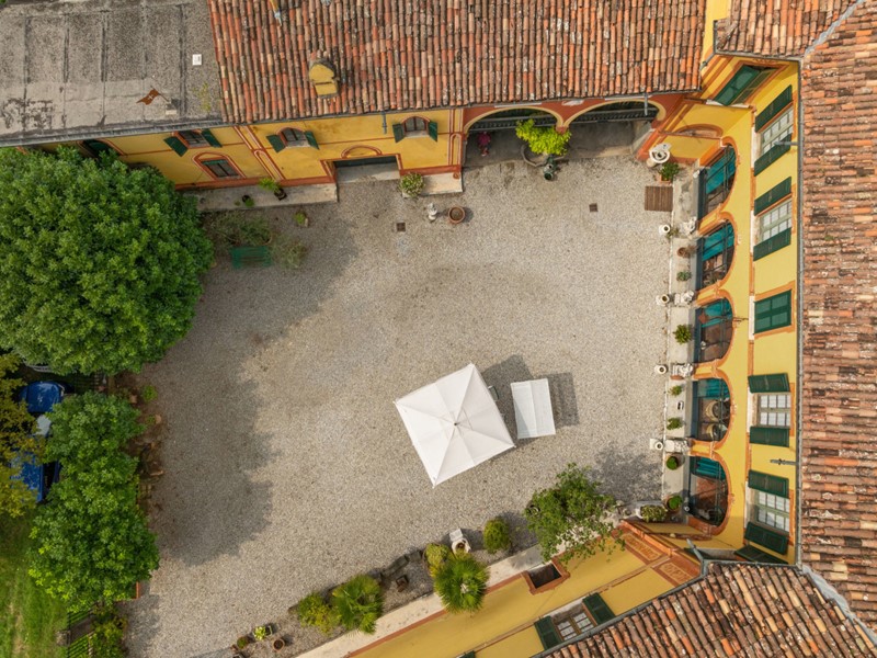 Dal pregevole vano scala si accede poi al salone principale con triplo affaccio sulla corte e sul parco esterno.