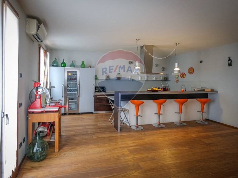 Cucina aperta su soggiorno con isola centrale e ulteriore balcone.