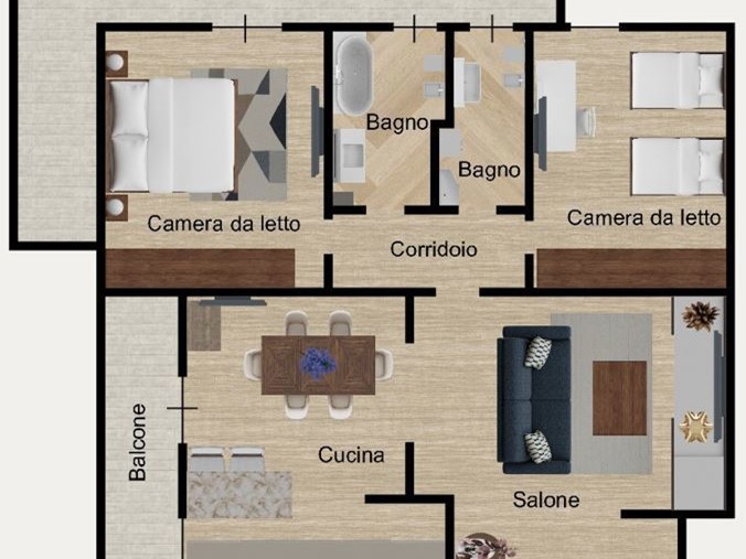 L ingresso si apre su un ampio salone, capace di accogliere sia una zona relax che un'area dedicata all intrattenimento. La cucina abitabile, separata e spaziosa, affaccia sul balcone principale, garantendo luce naturale durante tutta la giornata. Il disimpegno conduce alla zona notte, dove troviamo due camere ben proporzionate e due bagni, entrambi completi e ben rifiniti. La zona notte è servita da una balconata ampia e fruibile che offre ulteriore ariosità a tutti gli ambienti. Completano la proprietà circa 35 mq di balconate totali, ideali per chi ama la luminosità e gli spazi esterni.