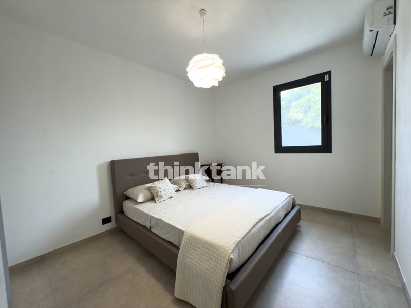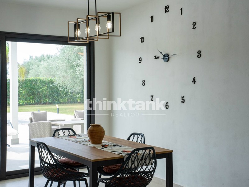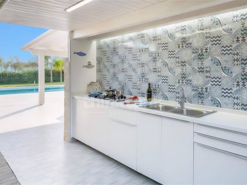 Disposta su un unico livello, la villa accoglie gli ospiti in un ampio e luminoso living room con cucina a vista, perfettamente integrato con gli spazi esterni grazie alle grandi vetrate che si affacciano sul giardino.