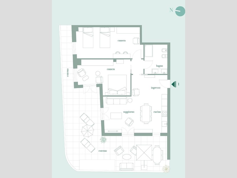 L'Appartamento è composto da un ampio soggiorno con angolo cottura, due camere, bagno e terrazzo.