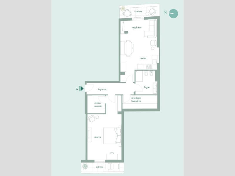 Lappartamento è composto da ingresso, soggiorno con cucina a vista, ampia camera matrimoniale con dressing, bagno, lavanderia e un grande ripostiglio, ideale come spazio aggiuntivo per ogni esigenza.
