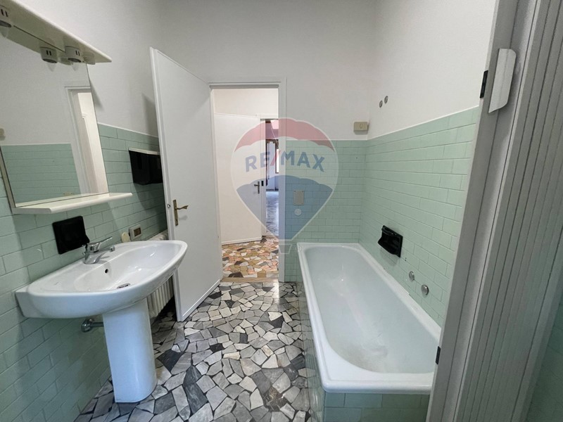 All'interno l'immobile apre con un corridoio, che da un lato due stanze intervallate da un bagno, altre due stanze sul lato opposto, un disimpegno con un ripostiglio ed un secondo bagno. Soffitti a 3 metri di altezza.