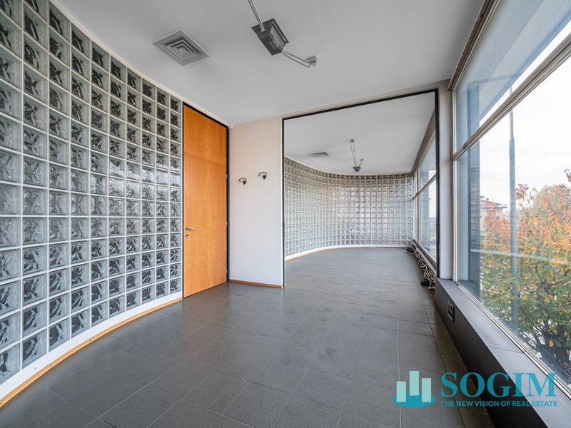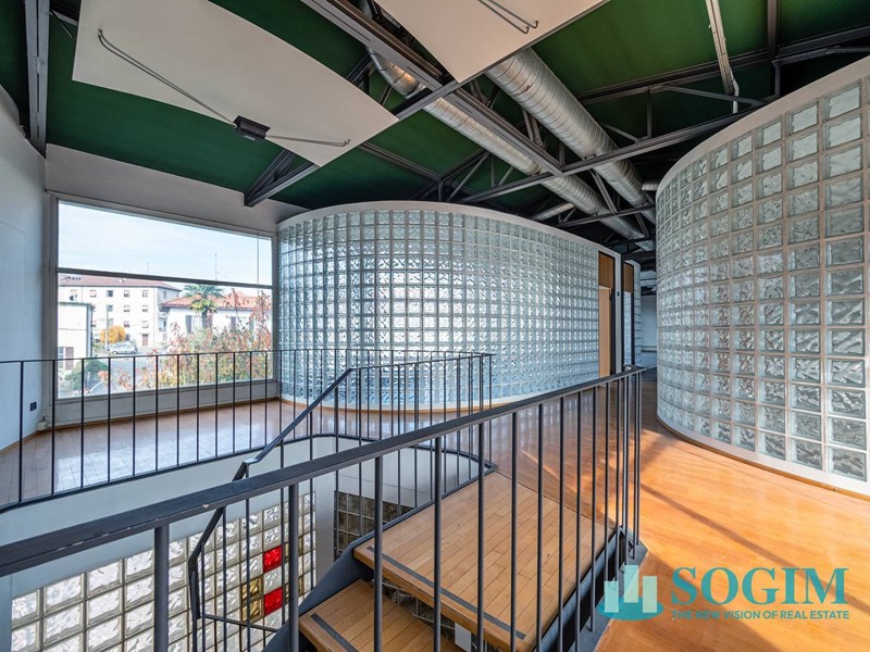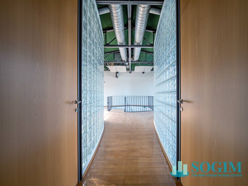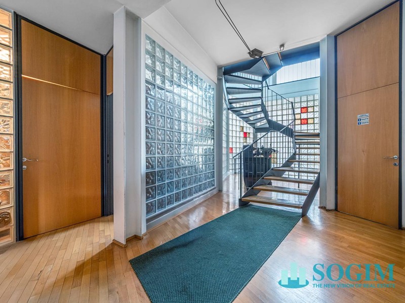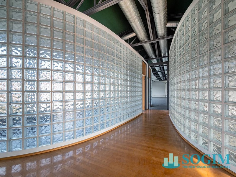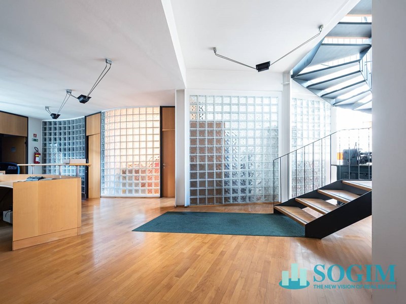 Un' elegante scala conduce al piano superiore che accoglie un ampio open space di mq 200 contraddistinto da suggestive pareti curve in vetrocemento che definiscono la aree di lavoro, preservando una luminosità diffusa e permettendo una versatilità di layout degli ambienti:è possibile creare uffici direzionali, una grande sala riunioni o postazioni operative multiple in un'ottica di sinergia e collaborazione prefessionale .