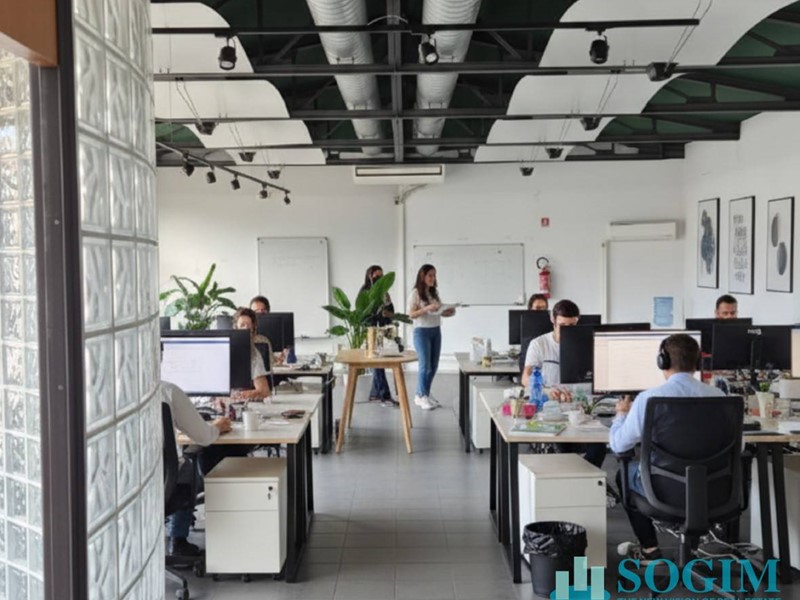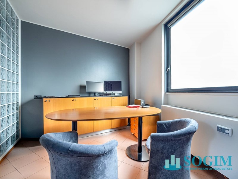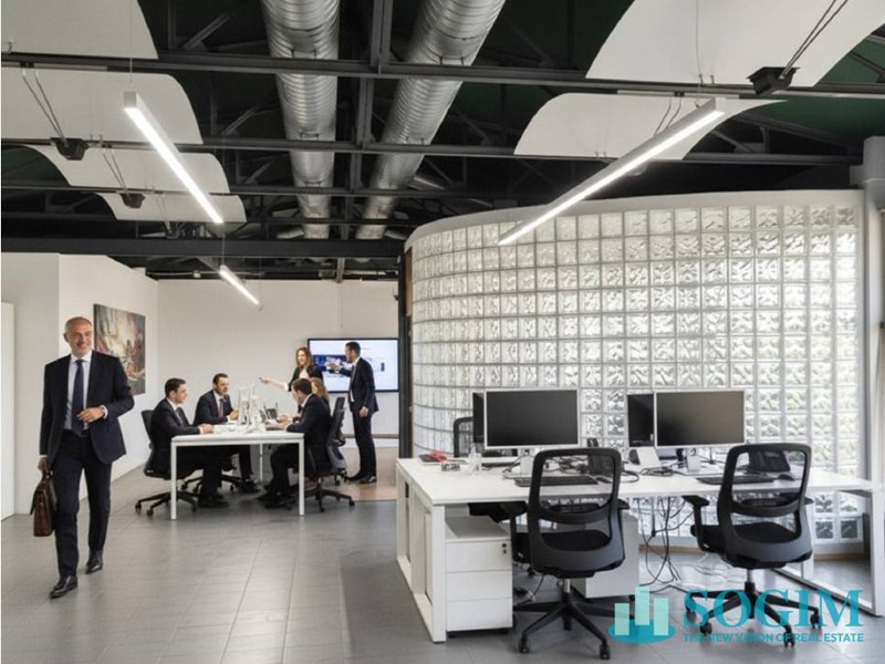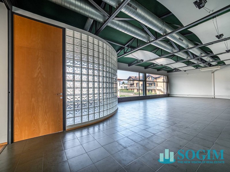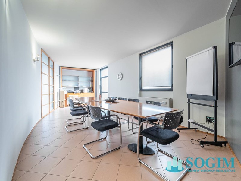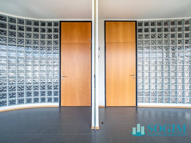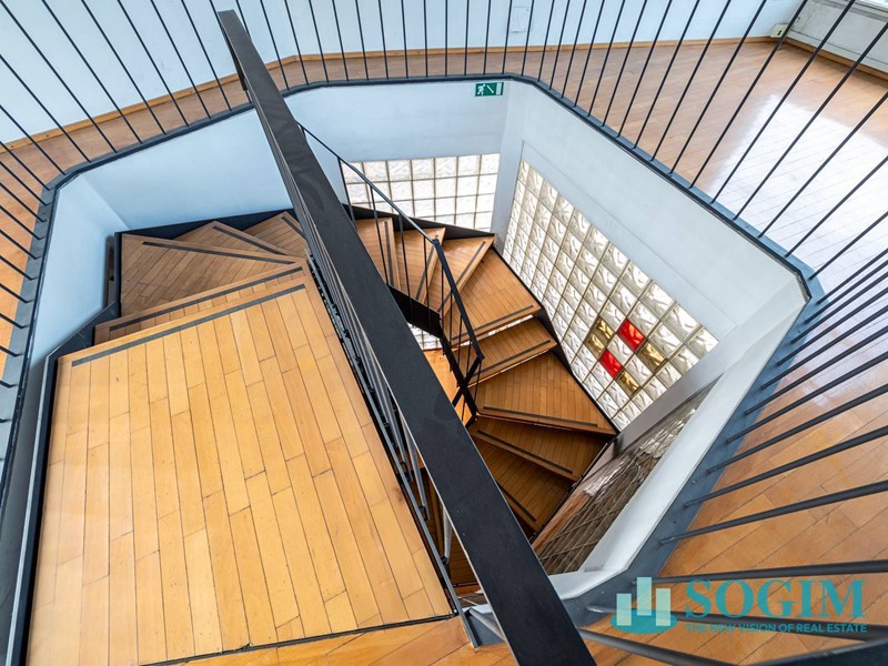 Un' elegante scala conduce al piano superiore che accoglie un ampio open space di mq 200 contraddistinto da suggestive pareti curve in vetrocemento che definiscono la aree di lavoro, preservando una luminosità diffusa e permettendo una versatilità di layout degli ambienti:è possibile creare uffici direzionali, una grande sala riunioni o postazioni operative multiple in un'ottica di sinergia e collaborazione prefessionale .
