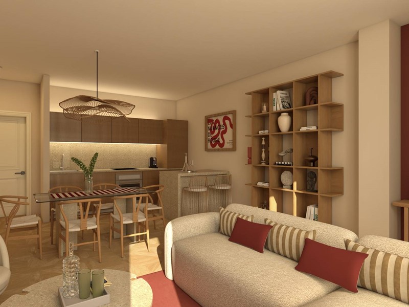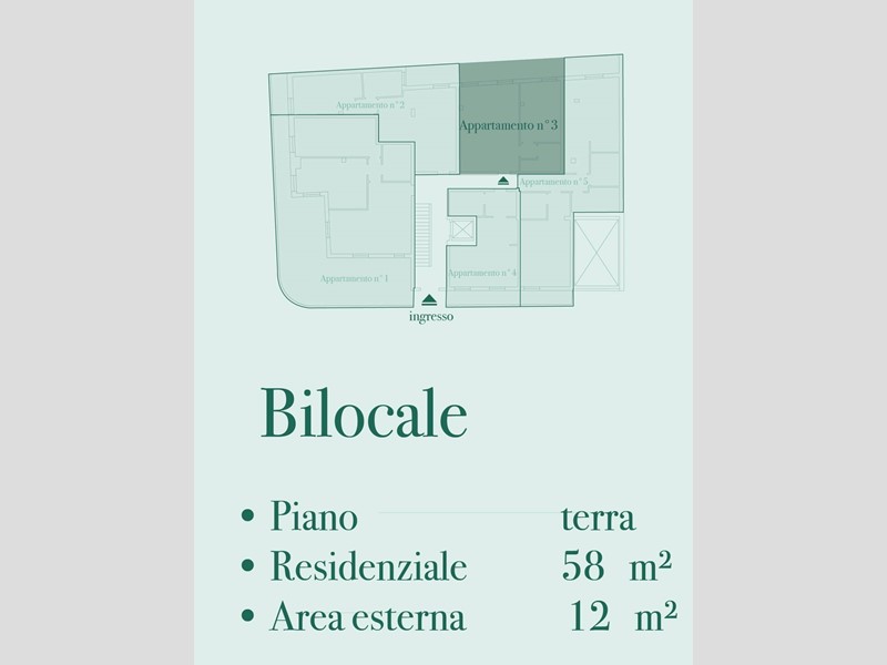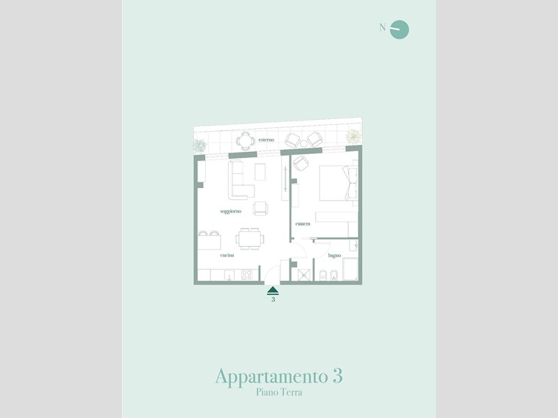 Lappartamento è composto da un ampio soggiorno con angolo cottura, un disimpegno con zona lavanderia, una camera matrimoniale e un bagno moderno con box doccia.