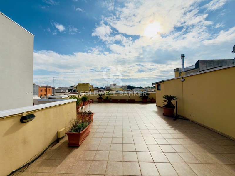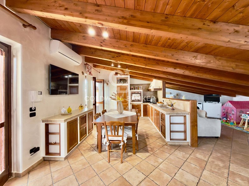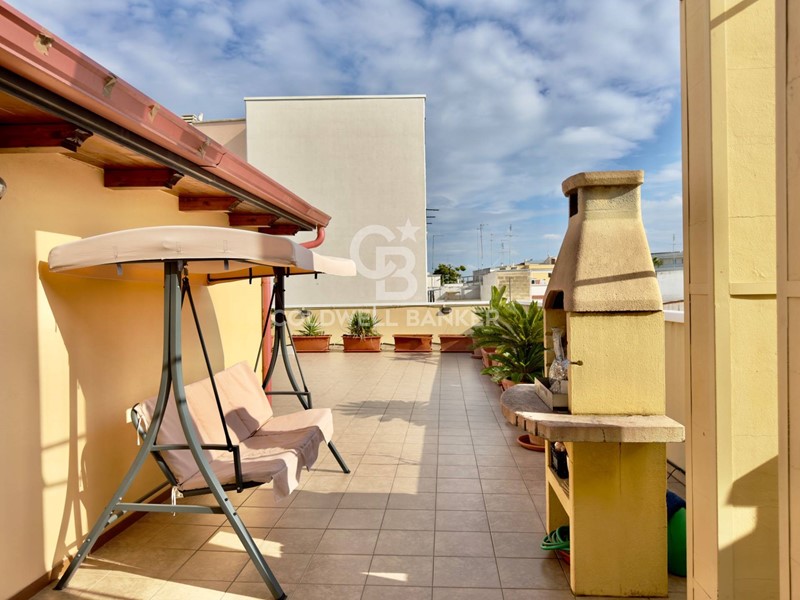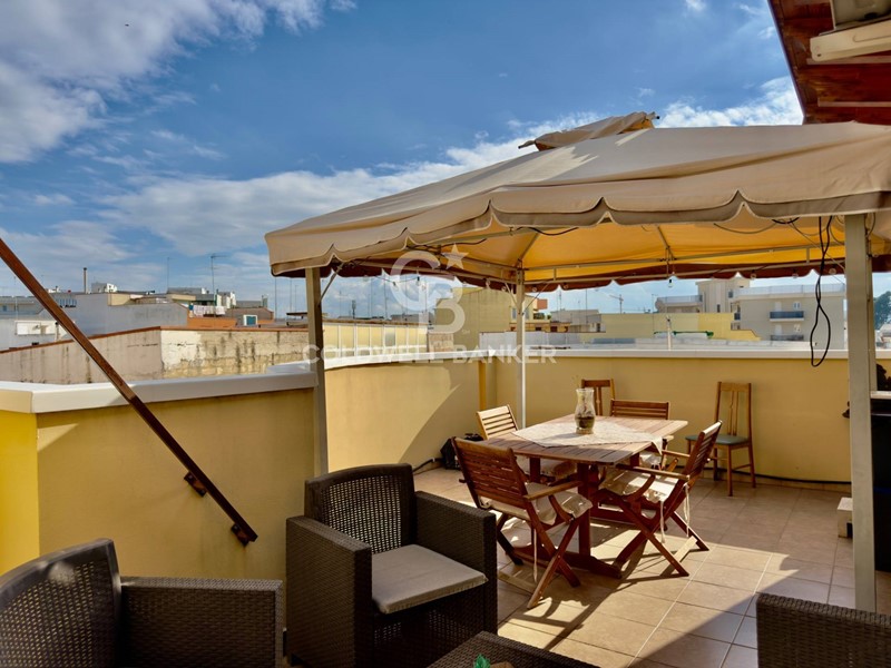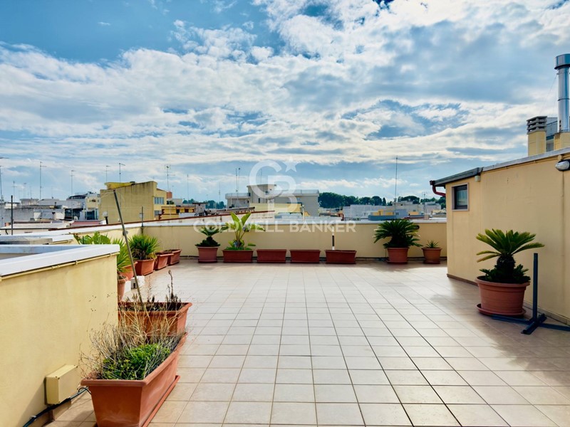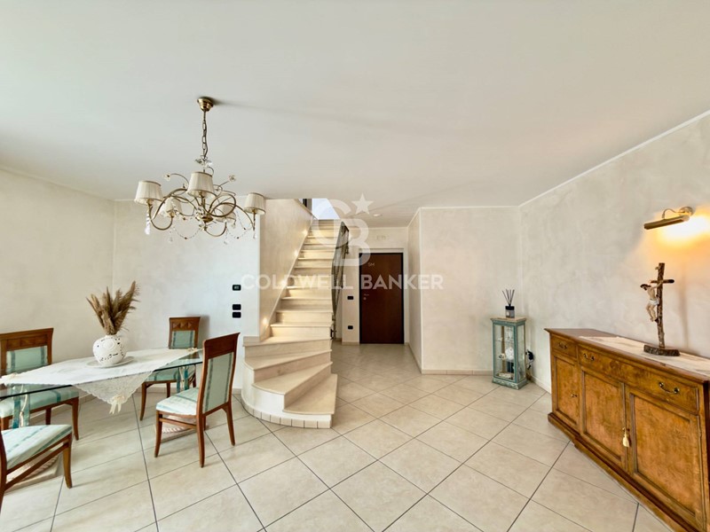 Una splendida scala in marmo di Trani conduce al piano superiore, dove si sviluppa una raffinata mansarda di circa 60 mq: qui trovano spazio una cucina open space in muratura, un bagno e una terrazza privata, perfetta per momenti di relax o convivialità allaperto.