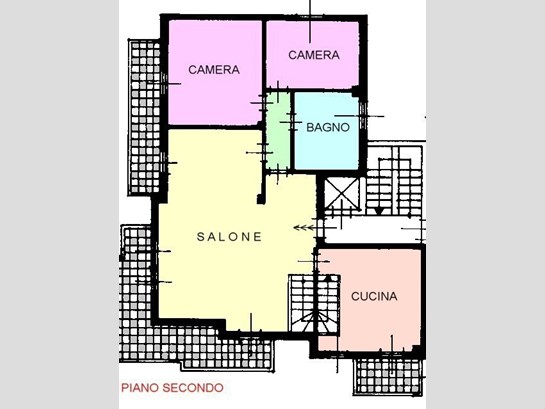 Piano secondo: ingresso su doppio salone in parquet, cucina abitabile di base quadrata, due camere, bagno di ampie dimensioni. Tre balconi .