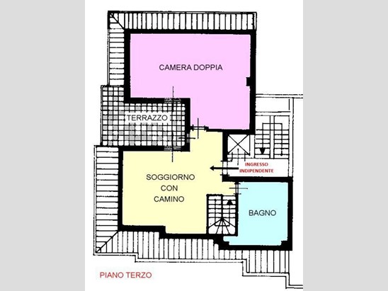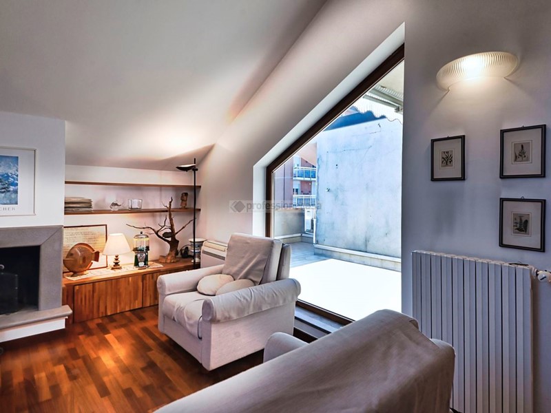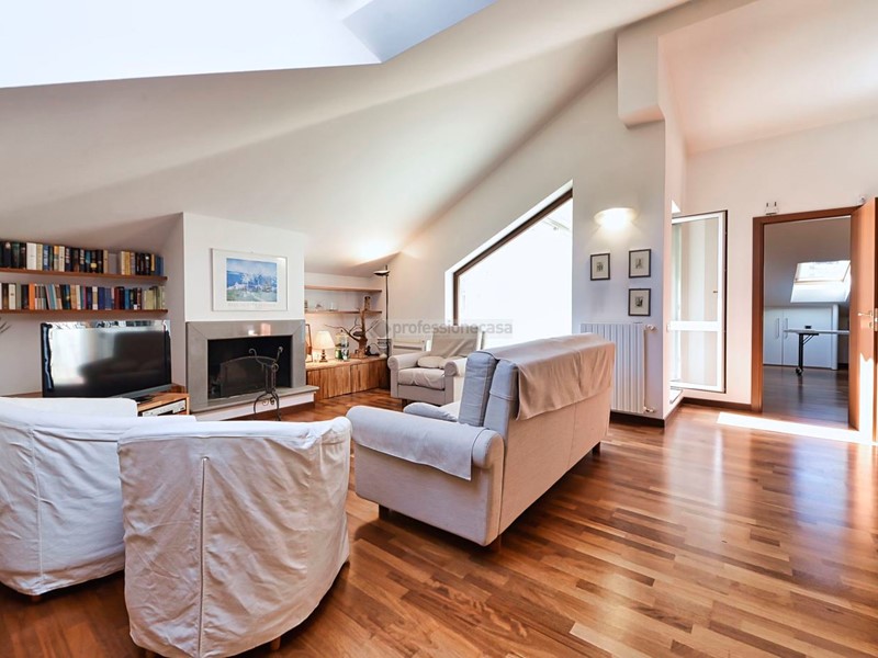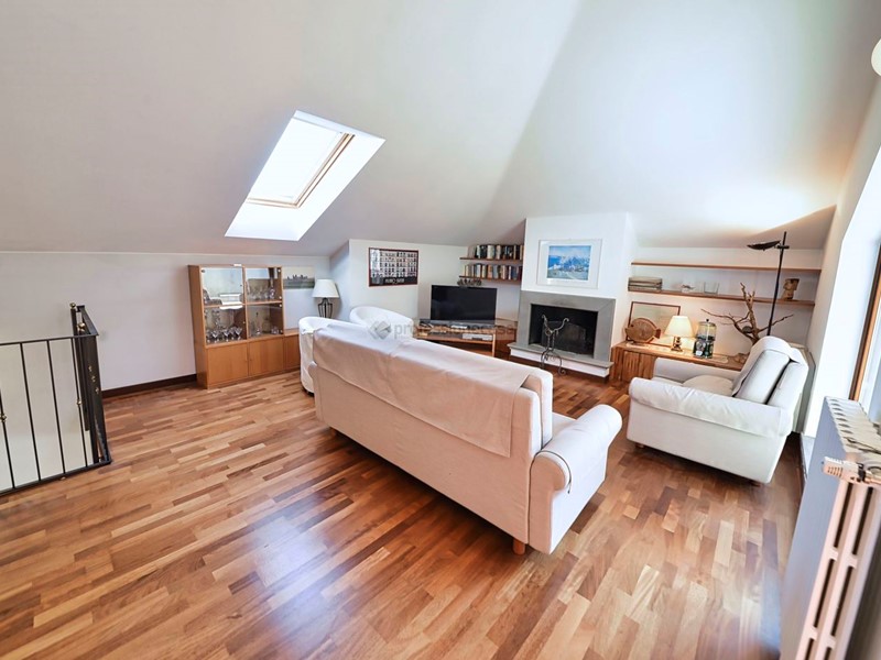 Terzo piano (dotato di secondo ingresso con porta blindata): ampio salotto con camino, rivolto al terrazzo di 27 mq, ideale e ricercato spazio esterno; locale hobbies / camera, ampio servizio.
